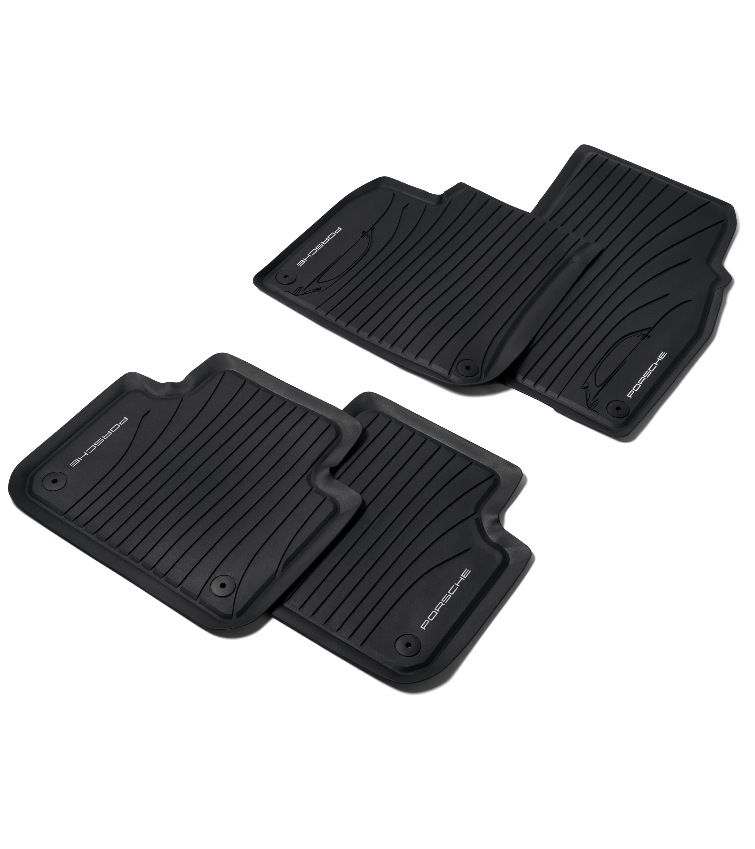 Vierteiliger Satz in ansprechendem Design mit Fahrzeugsilhouette und „PORSCHE“ Schriftzug. Verrutschsicher und wasserundurchlässig mit hochgezogenem, umlaufendem Rand.
