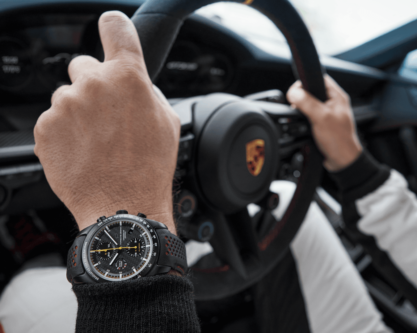 Das Zifferblatt in Sichtcarbon bietet unter kratzfestem, beidseitig 7-fach entspiegeltem Saphirglas inkl. Hartbeschichtung einen sportlichen Kontrast zu den weißen Stunden-/Minutenindizes. Die Stundenindizes bestehen aus keramischer Superluminova-Leuchtmasse: für eine besonders lange Leuchtdauer beim nächsten Nachtrennen. Die Zeiger in PERFORMANCE (weiß), ESSENCE (schwarz) oder GT (gelb) erhöhen mit jeder Sekunde zusätzlich die Faszination. Der Porsche Design Uhren-Konfigurator bietet für den Individualfarbring rund um das Ziffernblatt sogar eine Auswahl von 123 verschiedenen Farben.