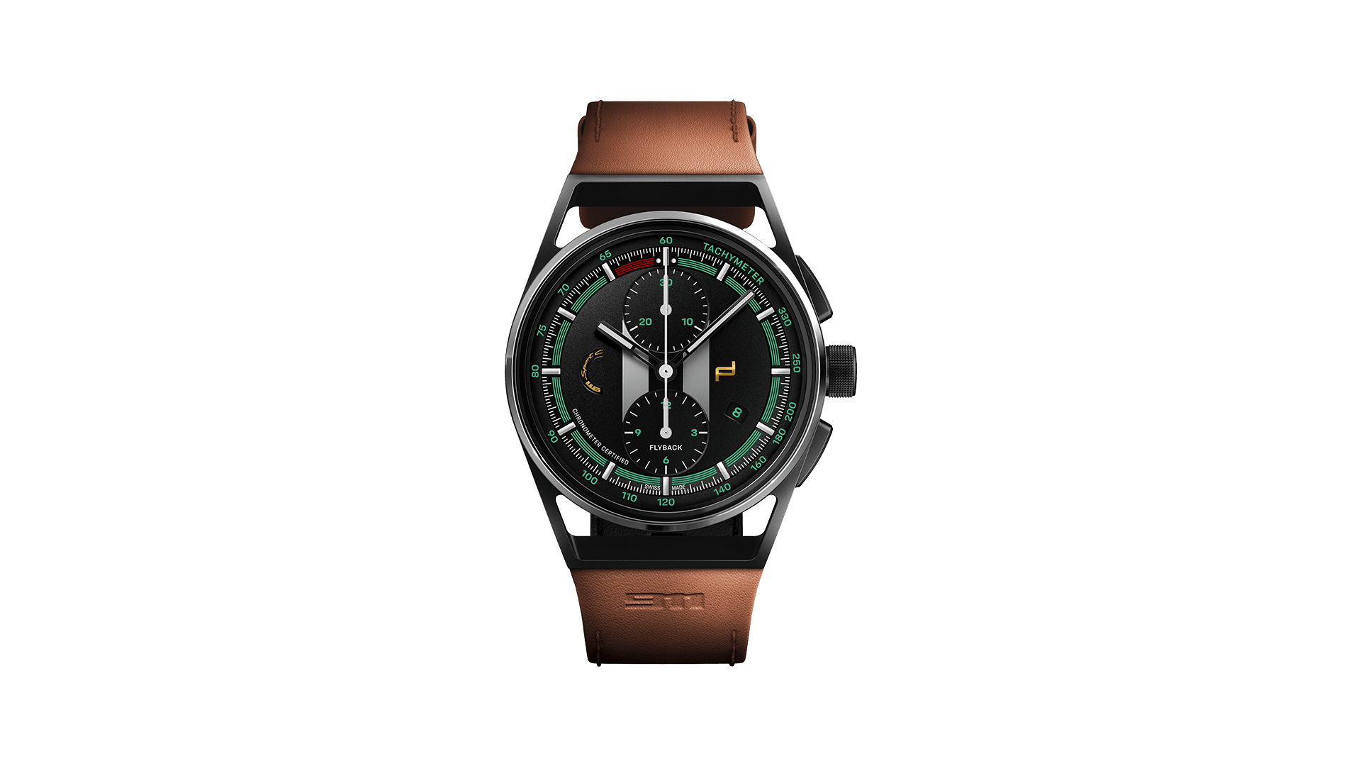 Der weiße Chronographenzeiger sowie die phosphorgrünen Ziffern und Skalenstriche im Heritage Design lassen auf den ersten Blick erkennen, in welcher Dekade der Chronograph 911 Sport Classic seine Inspiration fand. Erstmalig bietet Porsche Design die Individualisierung des Zifferblatts an: Neben dem klassischen, mattschwarzen Zifferblatt im Heritage Design können entweder die ikonischen Sport Classic Streifen in Sportgrau hell oder das für die 60er Jahre typische Pepita-Muster, mit dem auch das Fahrzeuginterieur ausgekleidet ist, ausgewählt werden.