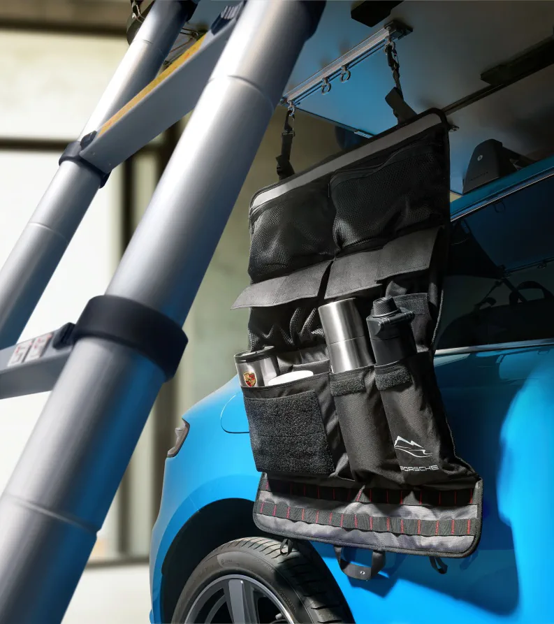 Selve ophænget med opbevaringsrum kan ganske enkelt hænges op ved siden af stigen på den forlængede bund i Porsche-tagteltet. Det elegante look rundes af med "PORSCHE"-bogstaverne og en påtrykt bjergsilhuet. Særligt praktisk: Så snart du er klar til næste jagt på kurver, kan ophænget med opbevaringsrum nemt foldes sammen og gemmes væk.