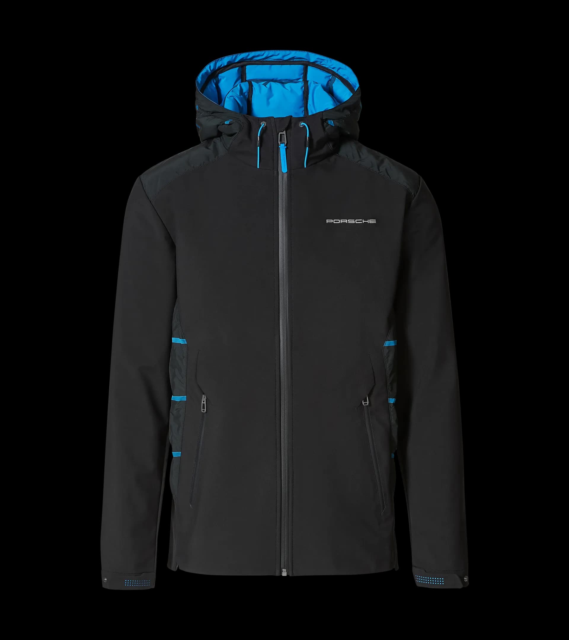 Chaqueta acolchada con capucha. Columna de agua de 3.000 mm [presión de agua en milímetro que soporta el material exterior antes de que penetre el agua] y transpirabilidad de 3.000 g/m²/24h [cantidad de líquido evaporado en gramos por metro cúbico en 24 horas]. Parte delantera, mangas y dobladillo de la espalda de tejido hardshell con interior de forro polar. Capucha, hombros, espalda y laterales con cámaras acolchadas en tejido de contraste. Con bolsillos laterales cortados por láser con cierre de cremallera. Puños de las mangas con botones automáticos ocultos. Elementos decorativos: anagrama «PORSCHE» reflectante en la pechera y perforaciones en los puños de las mangas.