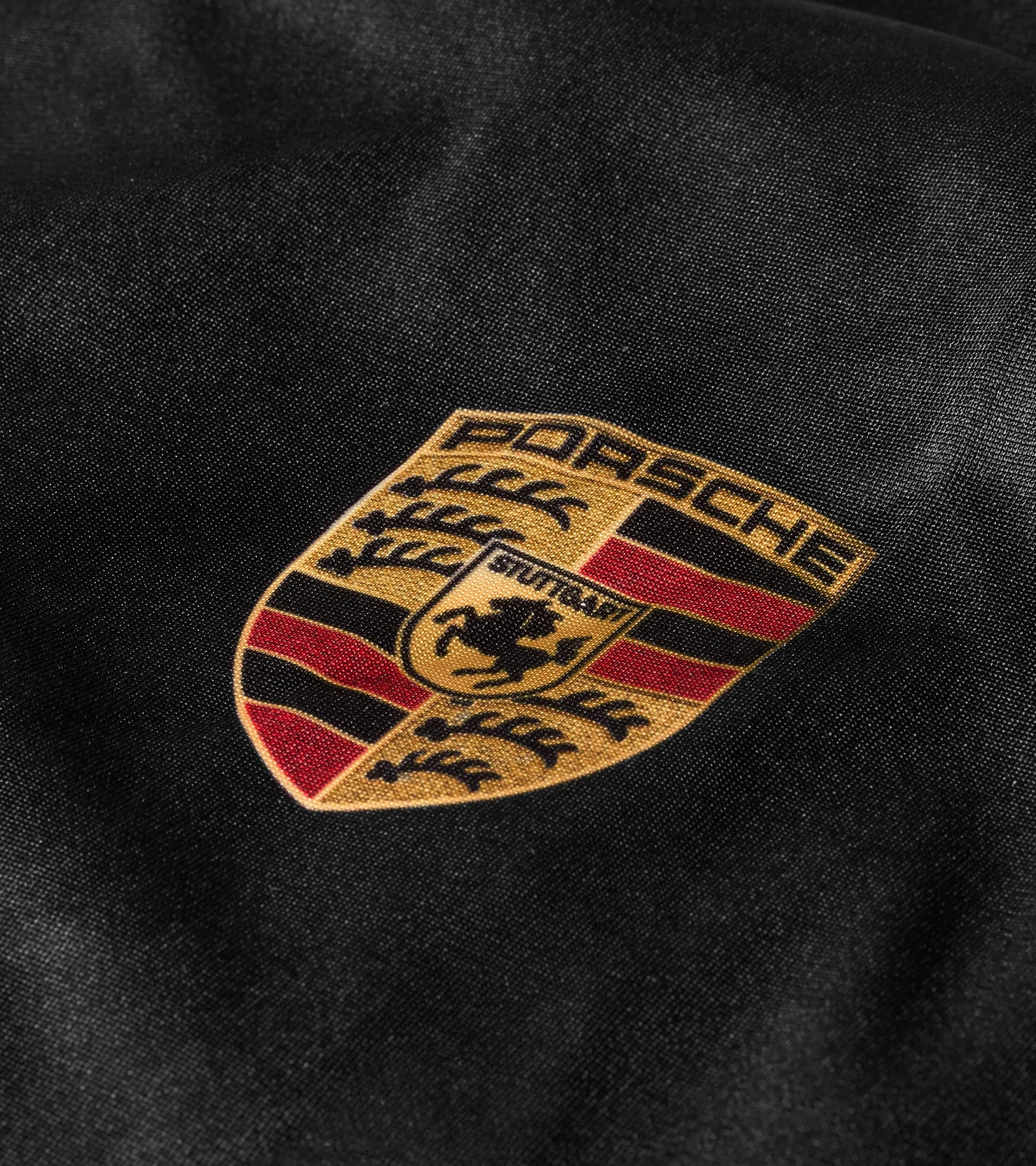 Funda negra para interiores a medida hecha de un material transpirable y antiestático que repele la suciedad. Con burletes grises, logotipo lateral 75 años Porsche y logotipo Porsche de colores en la tapa del maletero.