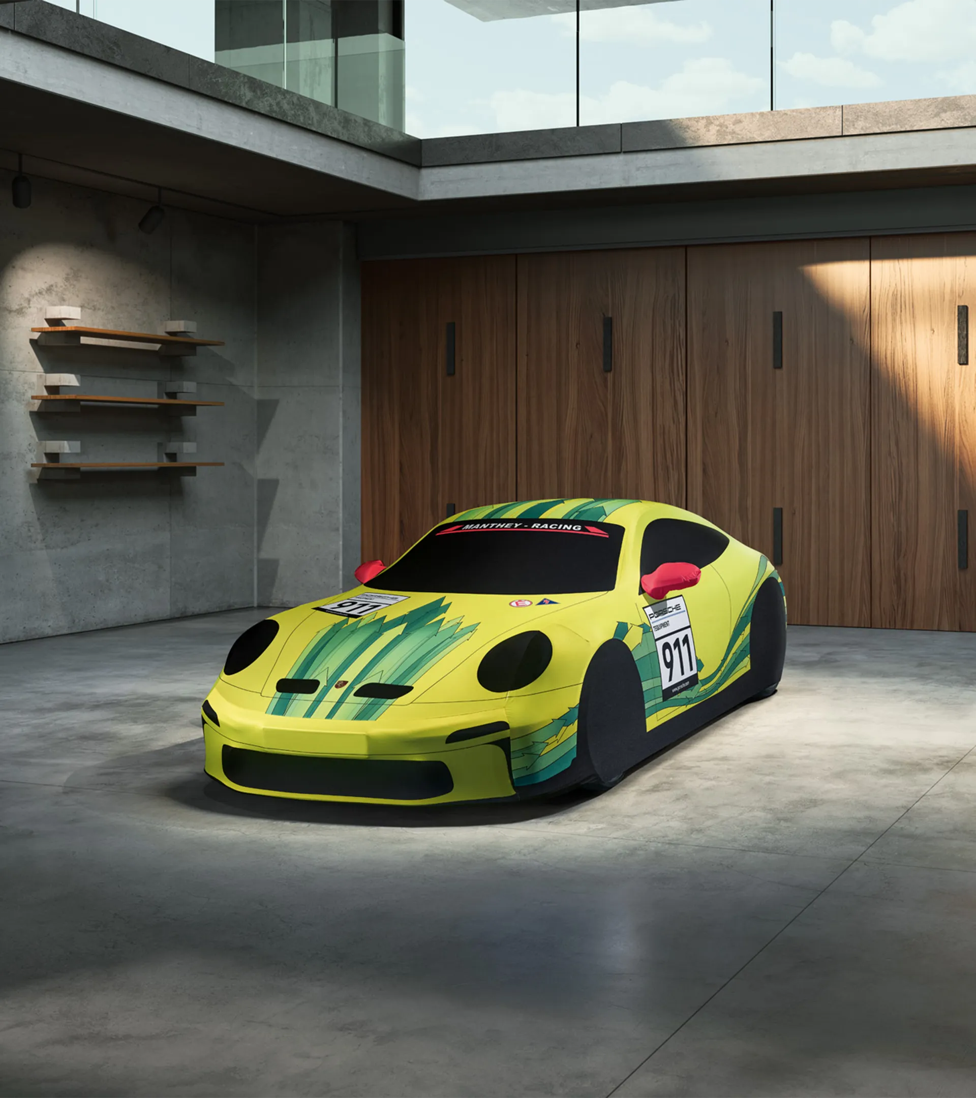 Con la funda Car Cover para interiores «Grello» puede disfrutar en su garaje del diseño de culto de una leyenda de Nürburgring y de una pieza de la historia del automovilismo: La funda Car Cover se basa en el emblemático coche de carreras 911 GT3 R de color amarillo-verde«Grello» con el número de salida 911 de Manthey-Racing, con sus llamativos colores neón.
