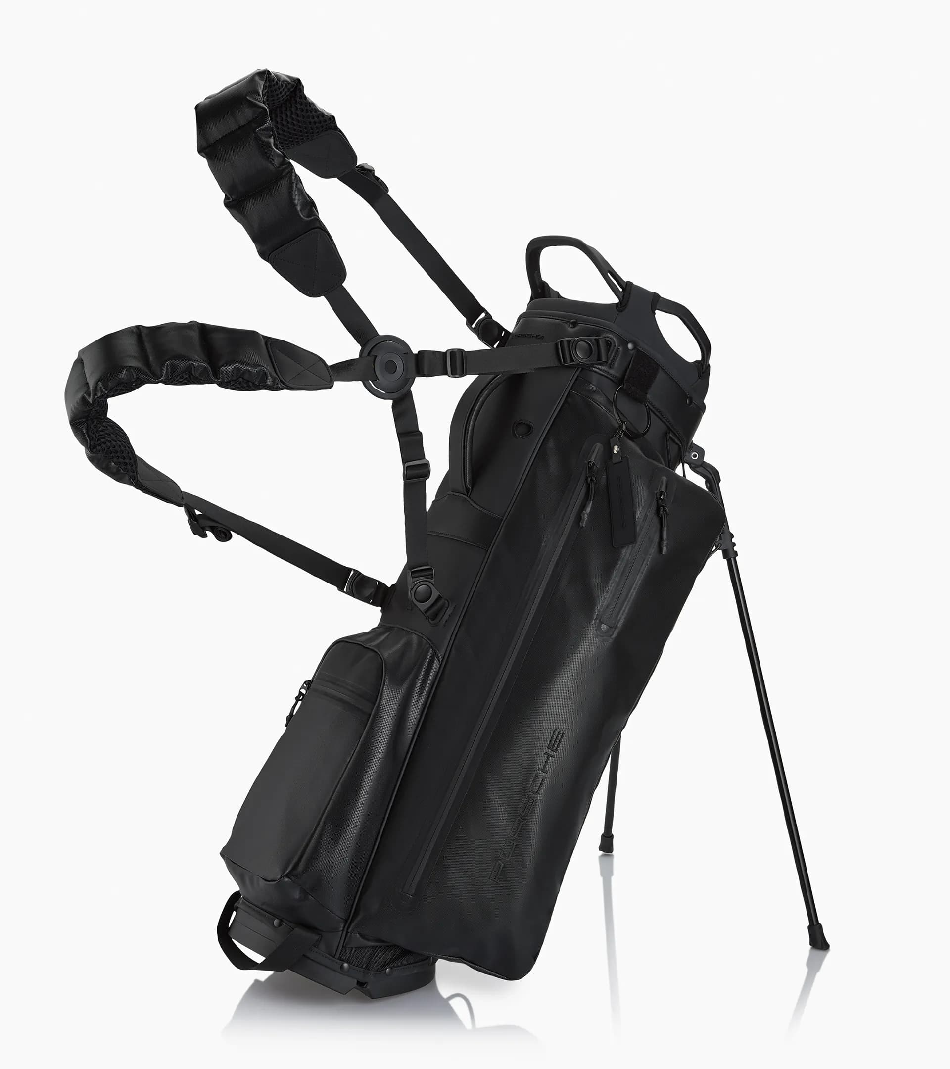 Sporty Porsche golf stand bag made of durable and water-repellent material with customization options.