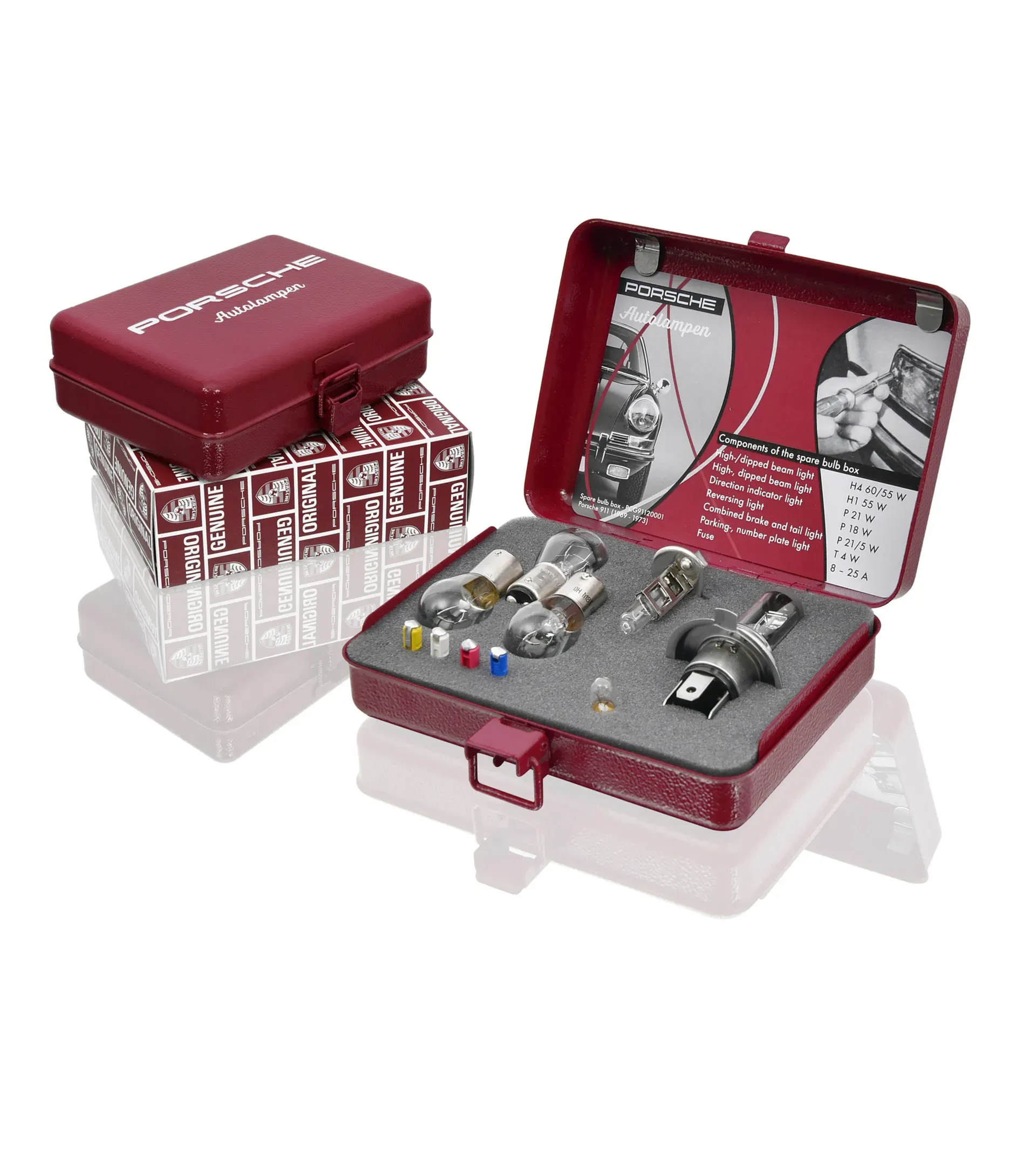 Les ampoules et les fusibles sont conservés dans une boîte métallique peinte dans la couleur Rouge Porsche historique, avec lettering Porsche en Blanc en relief et insert en mousse à l’intérieur.
