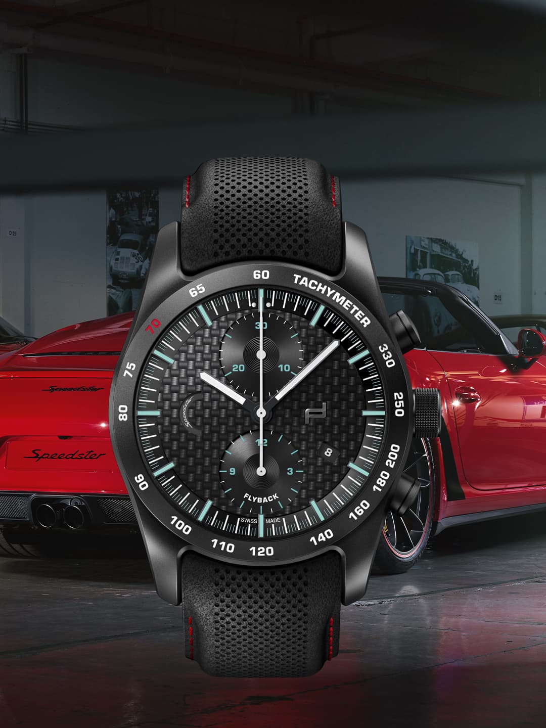 Front view Porsche Design Chronograph 1 - All Black Numbered EditionDetail view of Porsche Design custom-build Timepiece with red wristbandTop view of a Sport Chrono Subsecond 42 from Porsche Design