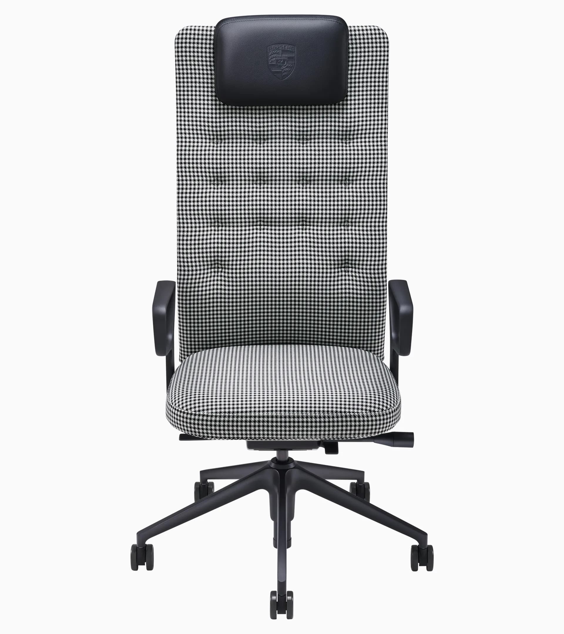 Ergonomic precision, slim design: the ID Trim L Pepita Edition by Vitra for Porsche combines functionality and design with precise craftsmanship using high-quality materials – for maximum seating comfort when working in the office or home office. A special design highlight is the original Porsche Pepita fabric on the seat and back, which elegantly blends in with the elegant look of the office chair. The adjustable lumbar support adapts perfectly to individual needs, ensuring optimal support. The headrest covers made of high-quality leather with embossed historical Porsche Crest round off the timeless design. The integrated FlowMotion mechanism, including forward tilt and seat depth adjustment, provides additional flexibility for optimal seating comfort, ensuring a relaxed posture even during extended periods sitting down. Limited to 911 units.