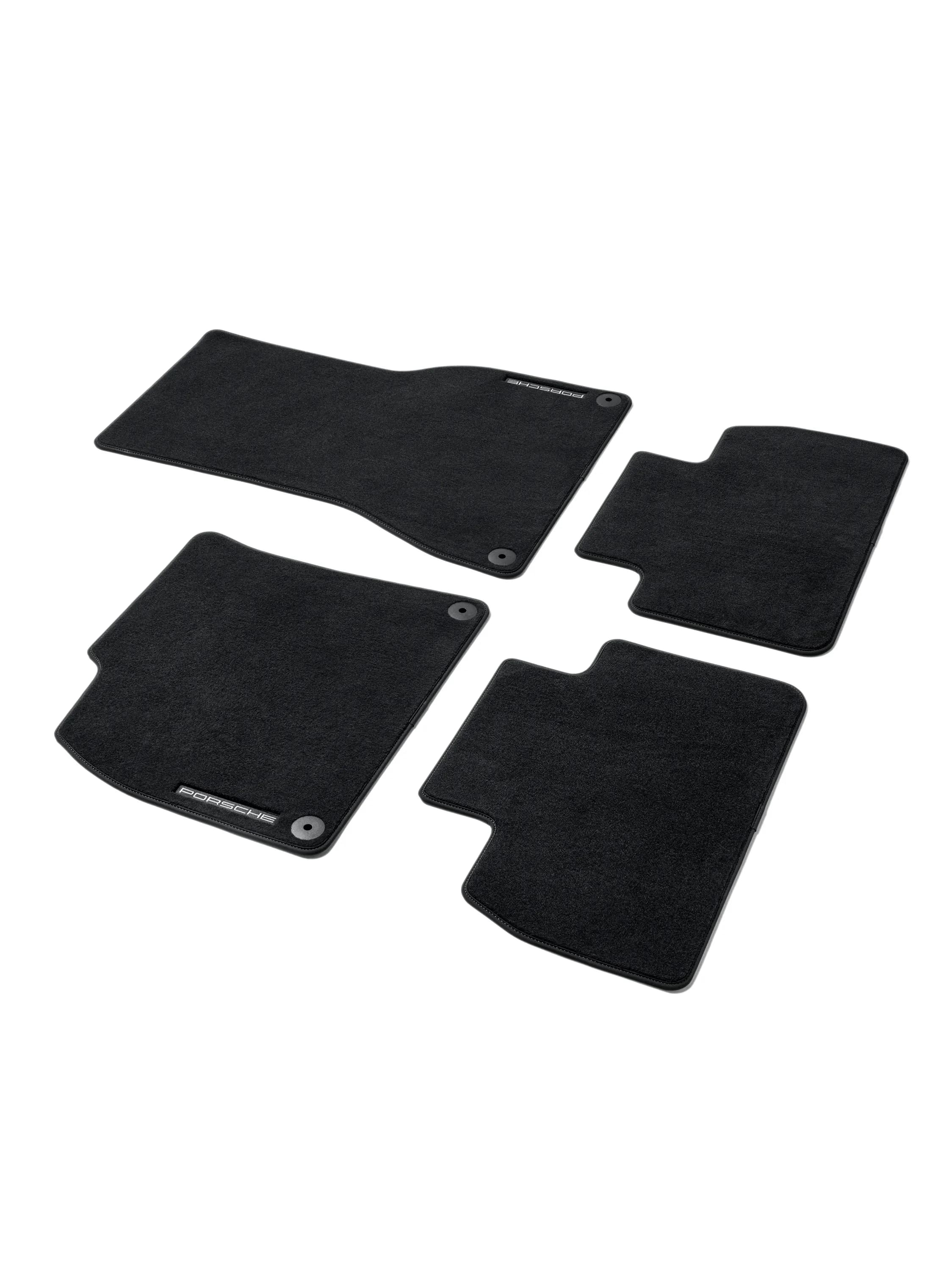 The four-piece floor mat set effectively protects the cabin of the Macan Electric Turbo from dirt and moisture. The high-quality Nubuck leather surround and the Turbo-specific embossing give the mats a high-quality look. The exclusive colour tone Turbonite is part of the new Turbo differentiation and is used as a contrast colour for the decorative stitching. The precisely fitting Black floor mats ensure reliable protection of the original carpets and can be easily removed from the vehicle for cleaning.