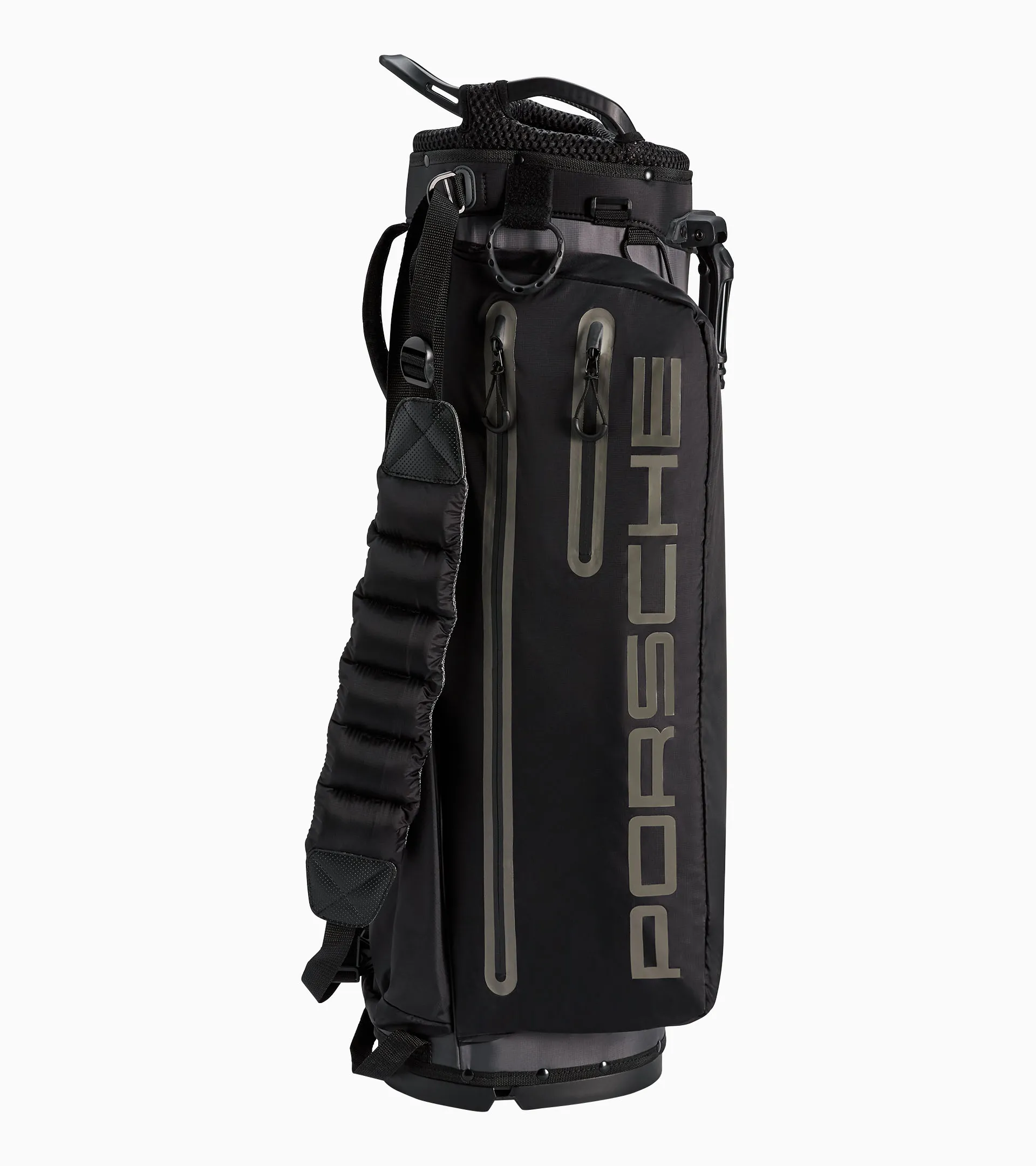 'PORSCHE' silicone print on the side.4-way divider for golf clubs.Comfortable, balanced and adjustable carrying system.Five outer pockets.Includes waterproof rain hood.Invisible integrated stand system.Umbrella, glove and towel holder.Water-repellent golf stand bag.