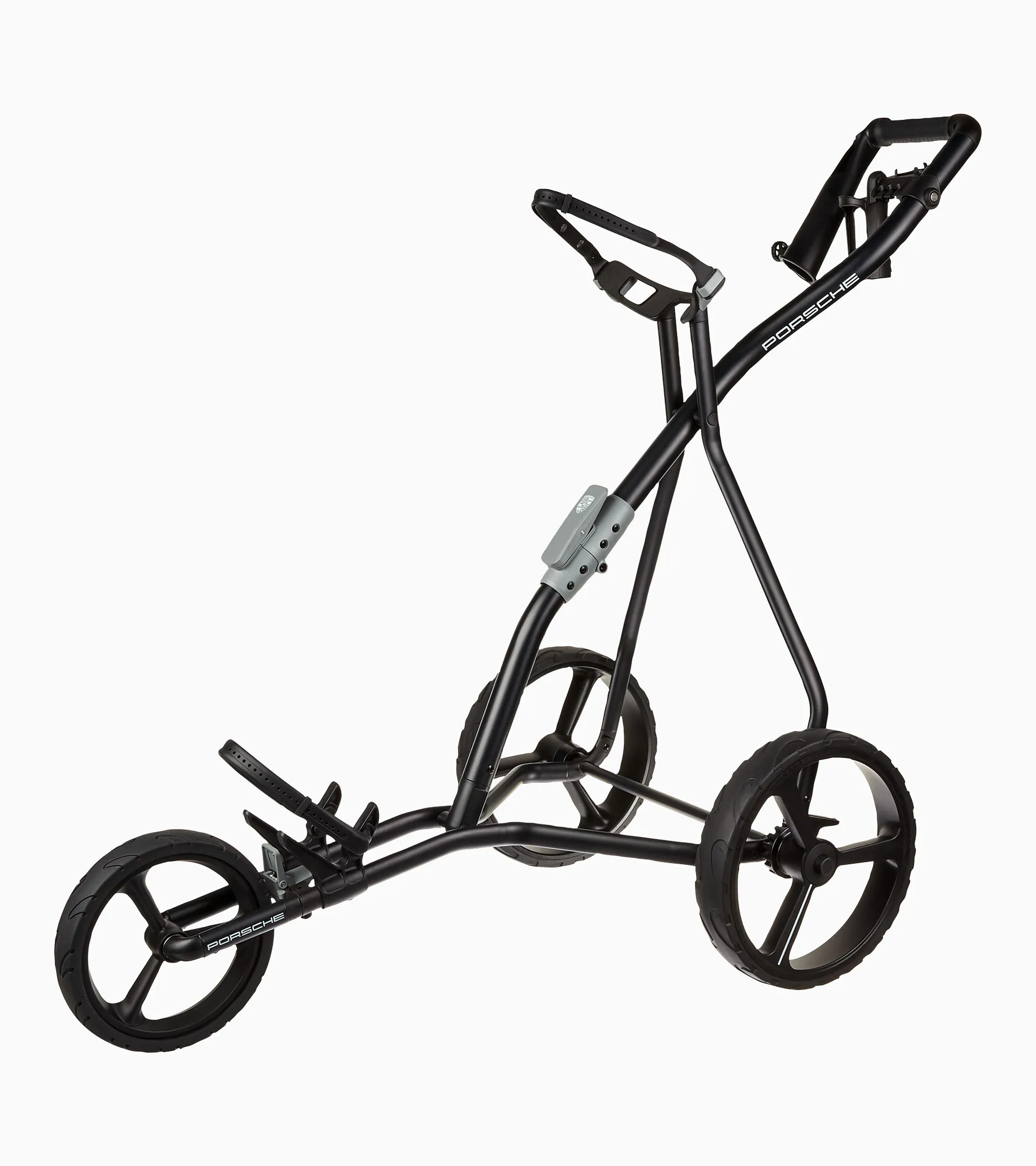 The extra-light golf trolley saves space and time on the way to the golf course: fully collapsible and with removable wheels, it can be stowed away in the included transport bag in no time at all. When you get to the golf course, you'll always have everything important at hand thanks to practical holders for scorecards, tees, drink bottles and umbrellas. 'PORSCHE' is printed on the trolley bar and the Porsche Crest is on the folding clasp.
