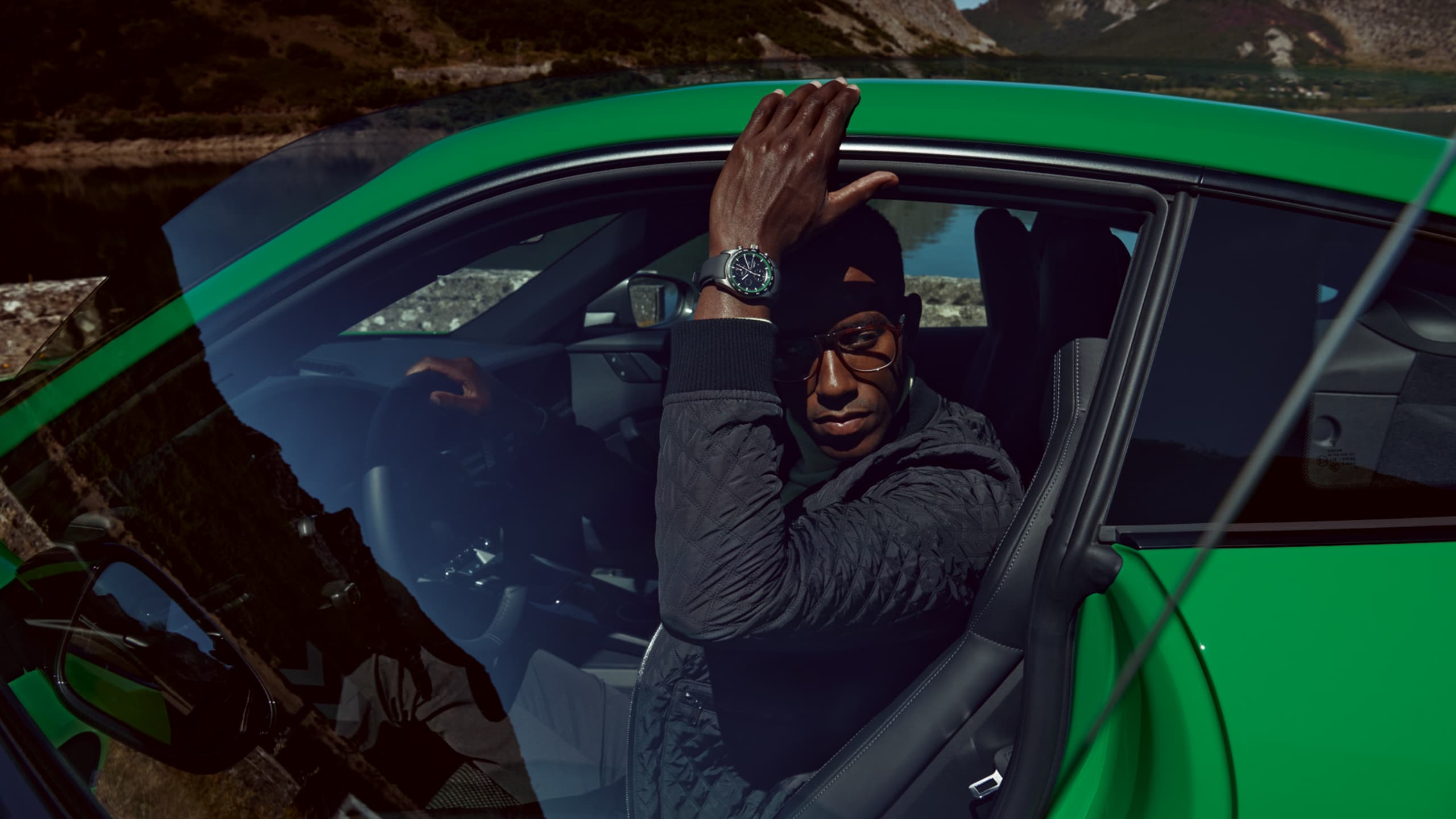 Man wearing a color matching Porsche Design custim-build Chonograph on his wrist, leaning on a green Porsche 911