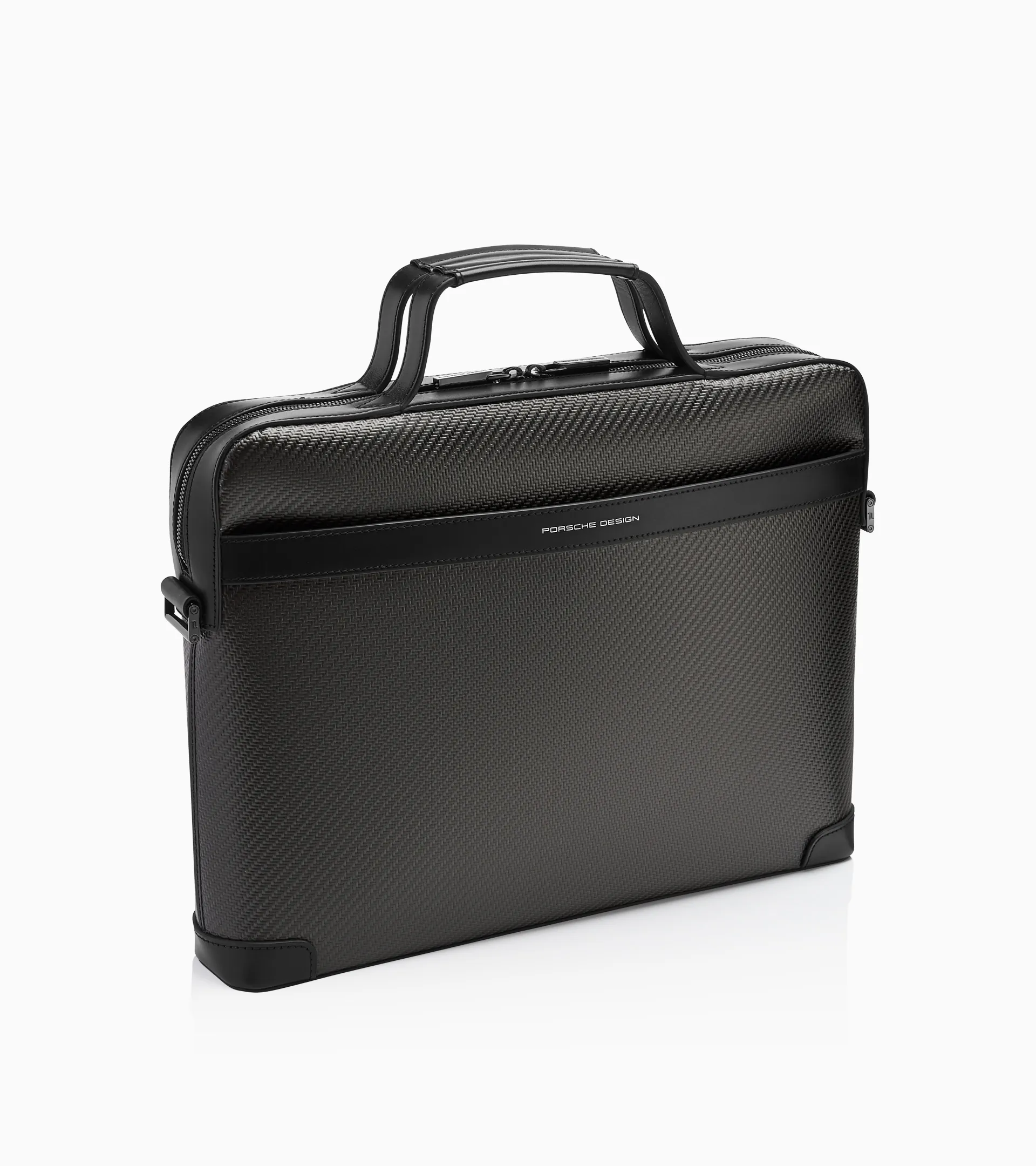 Modern Porsche Design briefcase in carbon and leather. The high-quality features of this business bag are extensive, including laptop compartment and trolley link.