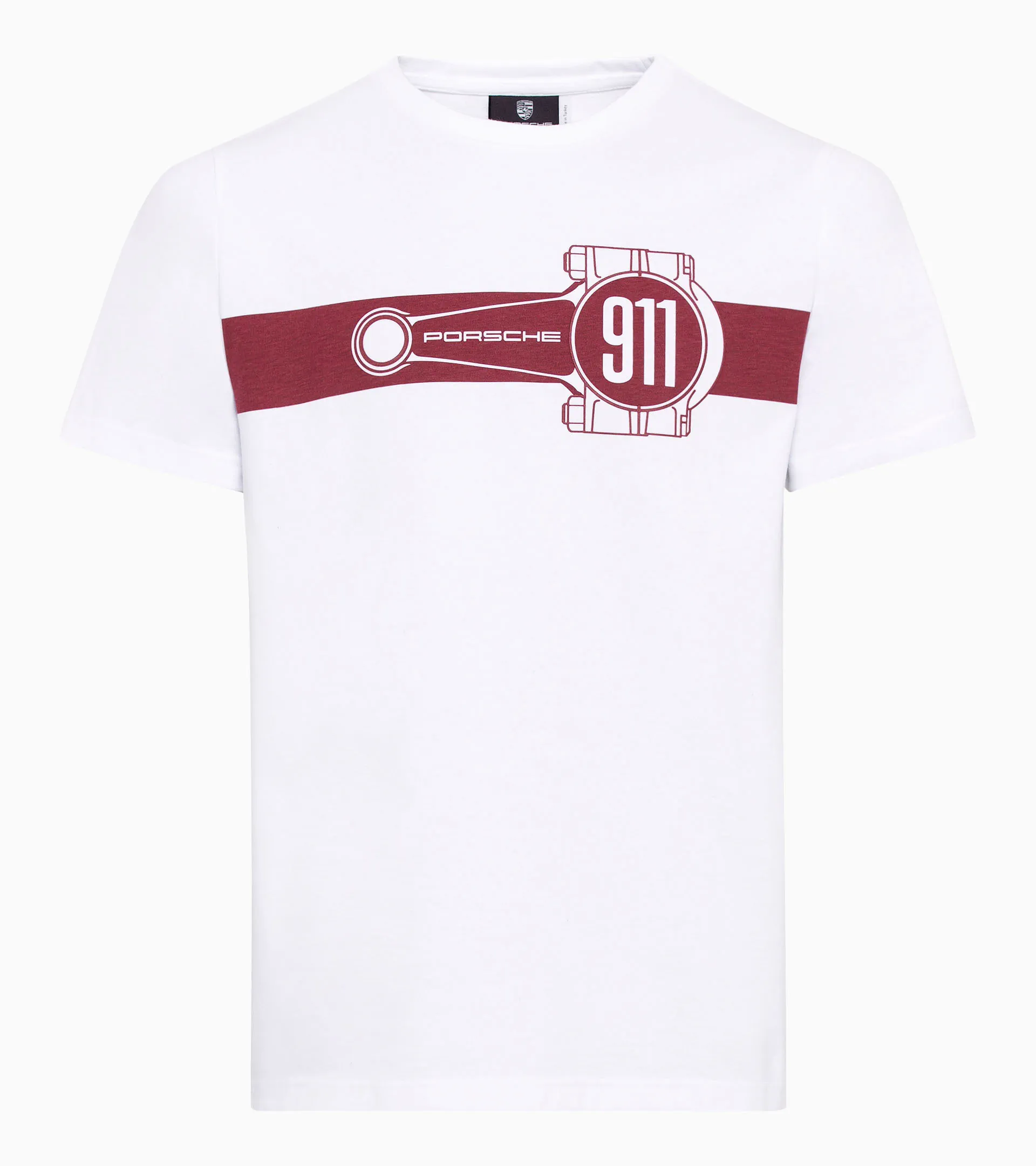 Favourite item of clothing for a casual everyday look: the Porsche half-sleeved T-shirt with crew neck and connecting rod print. The Porsche silicone print in the neck area and a small story label on the hem of the back set subtle highlights. The sleeve and T-shirt hems are double-stitched.