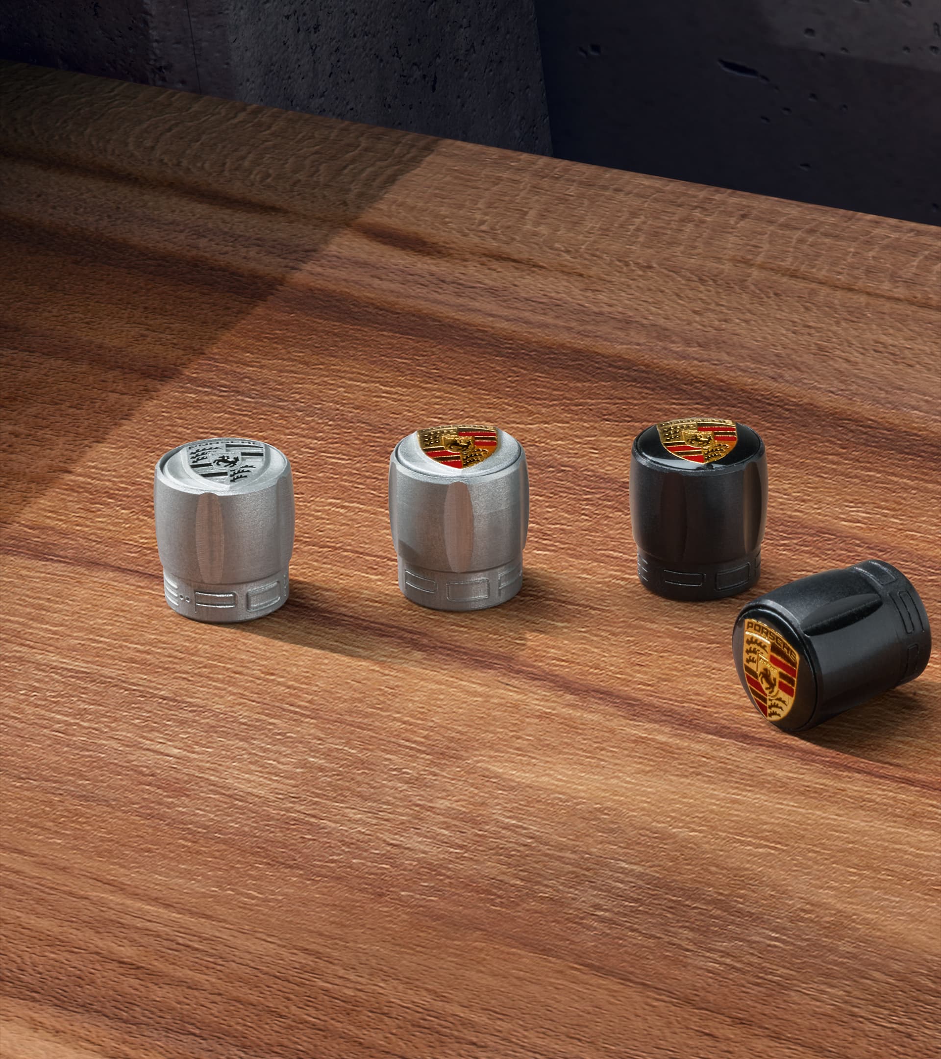 Silver-coloured aluminium sleeves with coloured Porsche Crest.