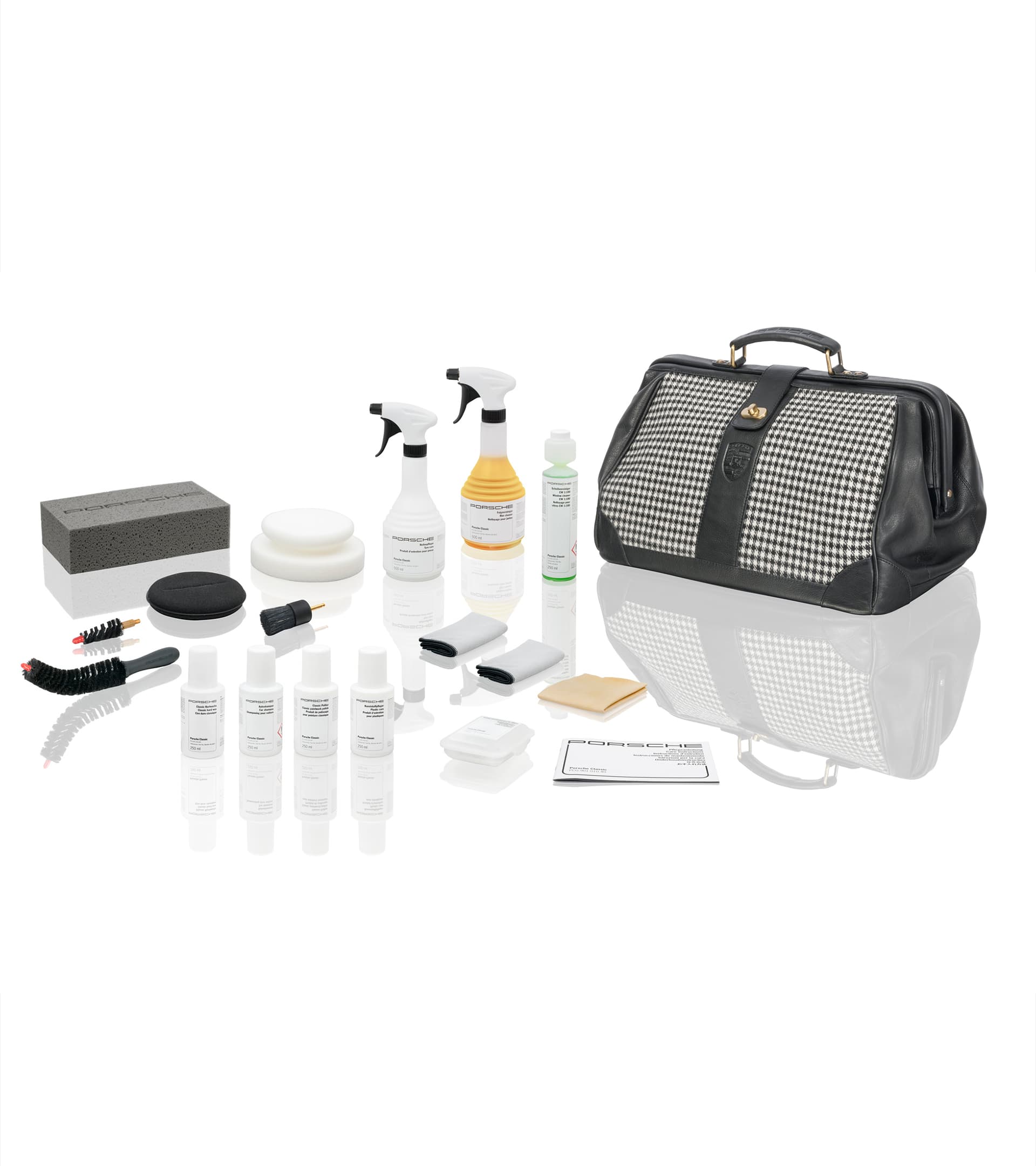 17-piece care kit developed by Porsche ClassicSuitable for the entire exterior and all Porsche lacquersHigh-quality storage bag in a pepita pattern