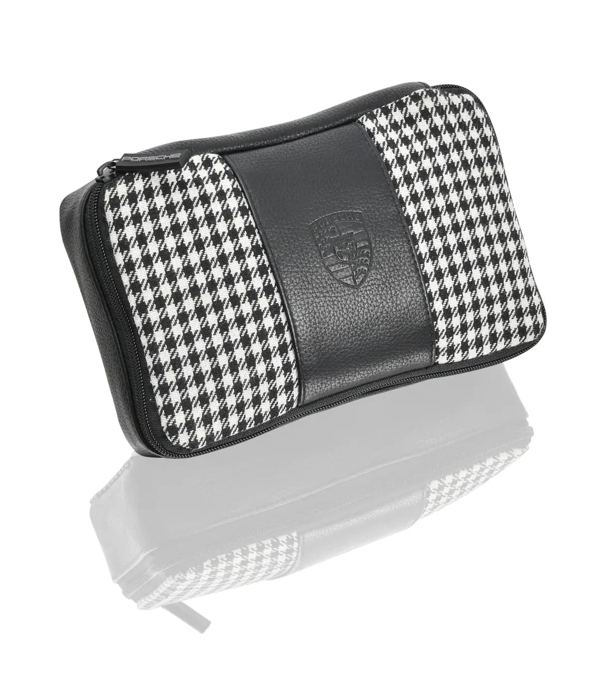 Available now for your classic car from Porsche Classic: the first-aid kit in contemporary houndstooth design and with an embossed Porsche crest in black leather.