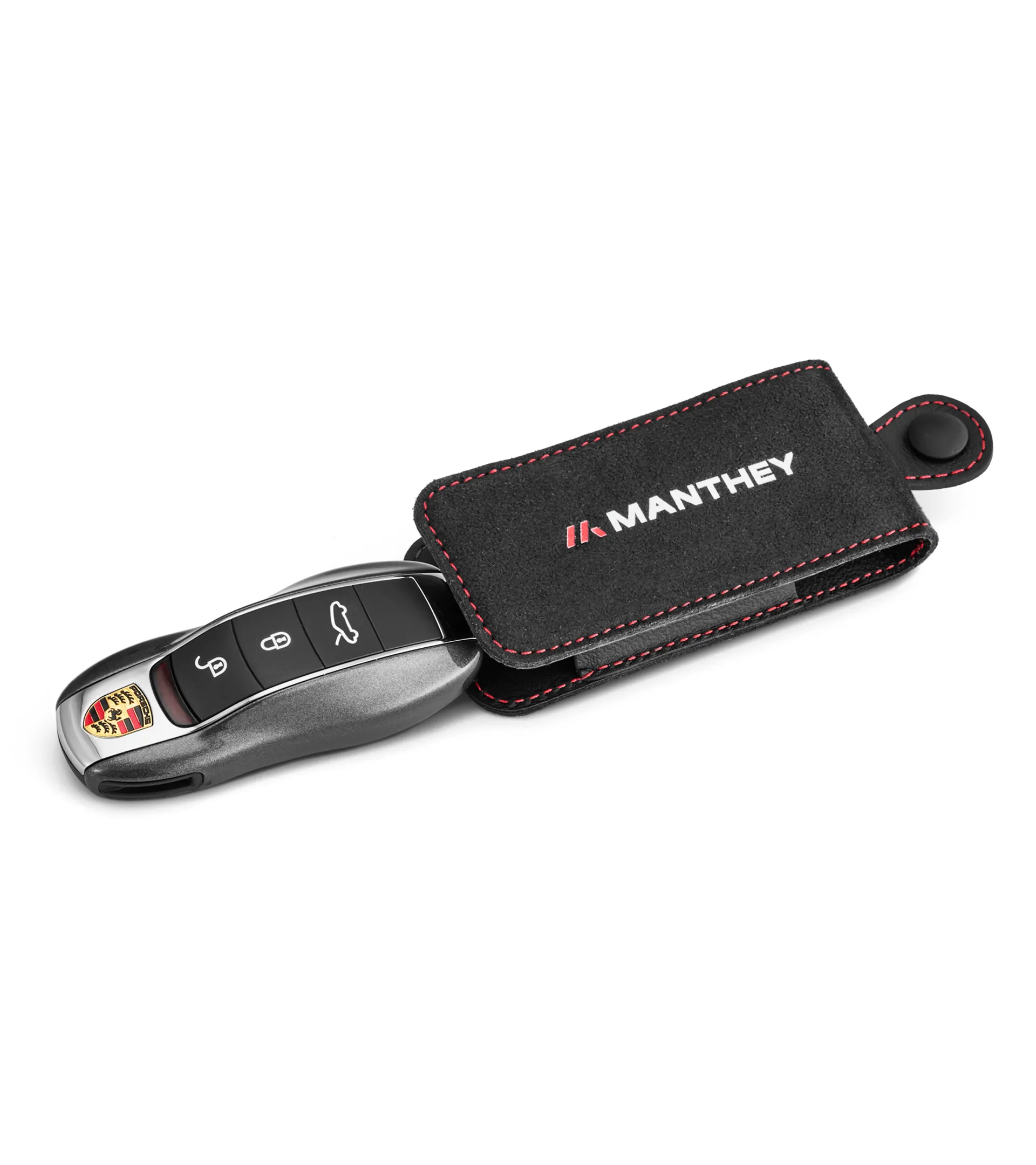Egy igazi motorsport-rajongó járműkulcsának tökéletes kiegészítője: a nyomtatott Manthey felirattal ellátott és piros varrással díszített fekete Race-Tex kulcstartó tok.
