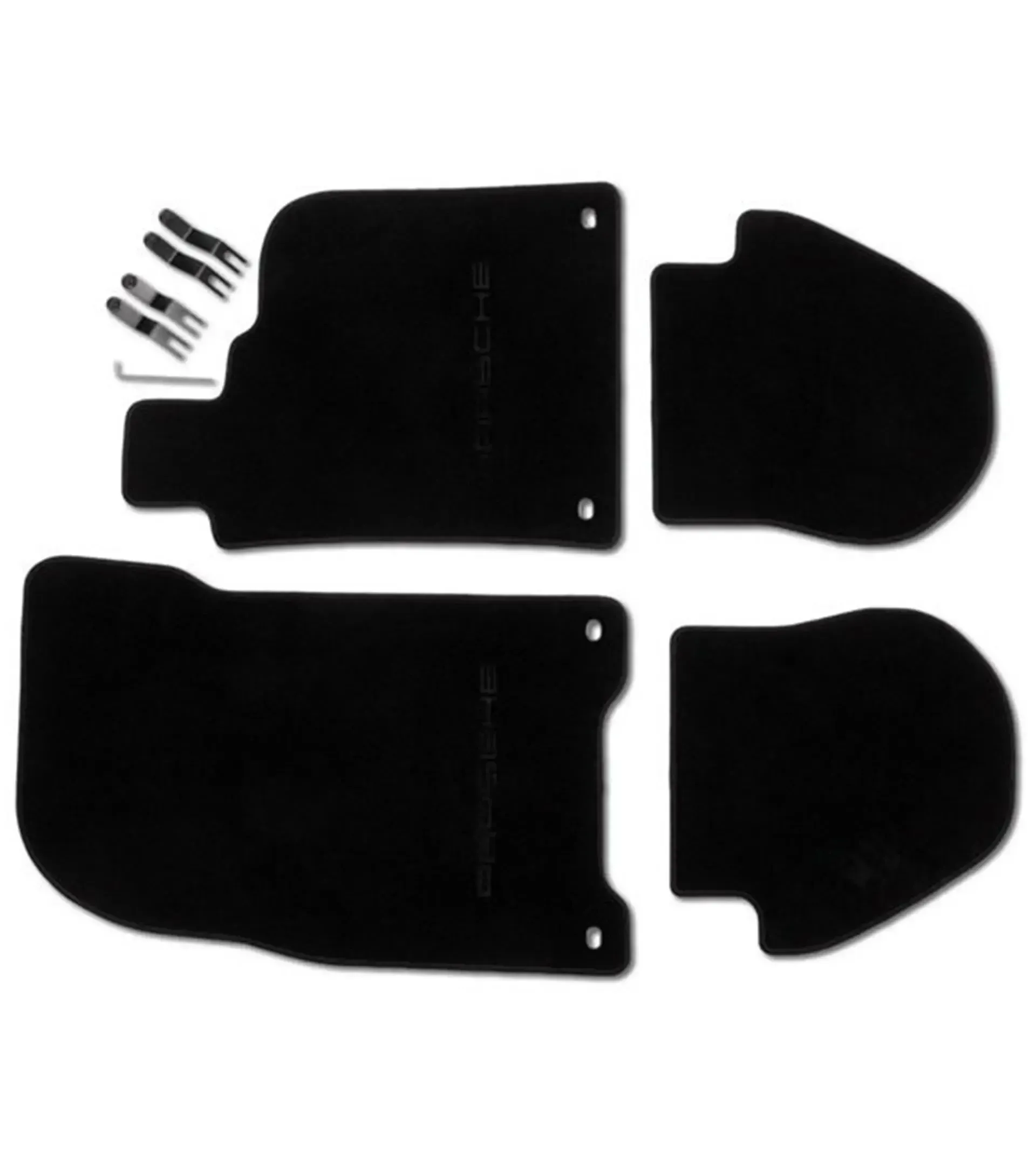 Set of four floor mats in Black for right-hand-drive vehicles, including fastening materials; suitable for Porsche 964 from years of construction 1989 to 1994 and for Porsche 993 from years of construction 1991 to 1998.