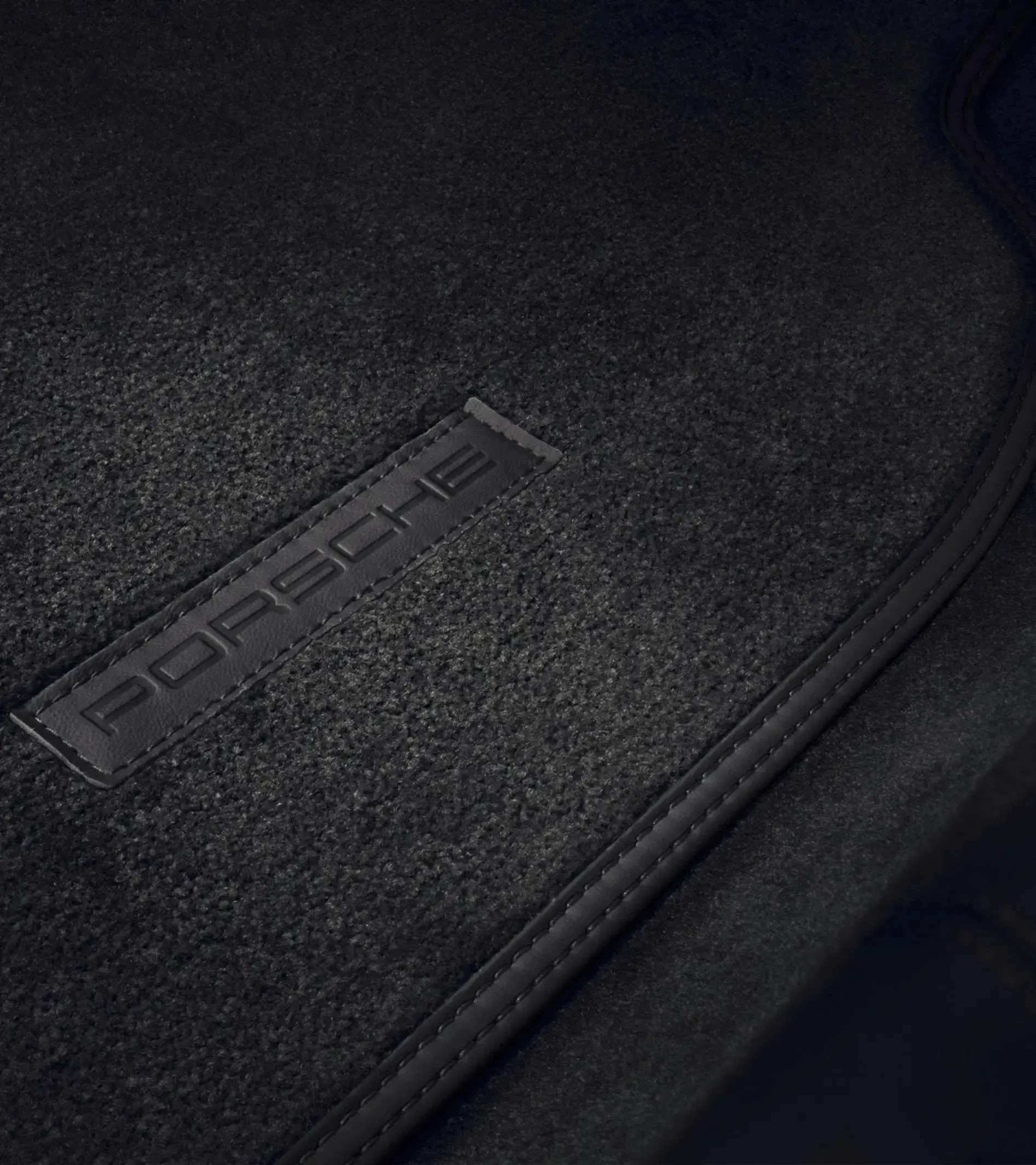 Two-piece set, carpet in Black. With surround and inlay with embossed "PORSCHE" logo in smooth Black leather and double stitching in Black. including Recess for Clubsport package fire extinguisher.