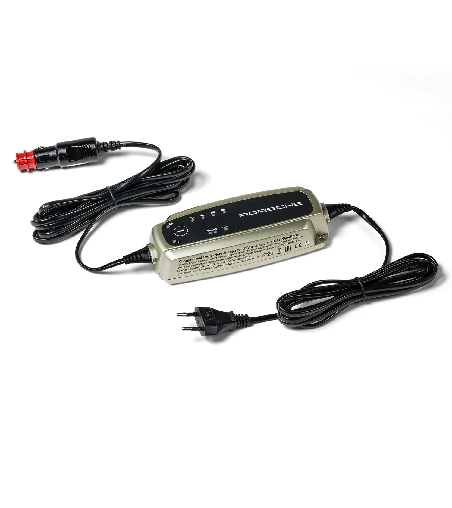 Charger (5.0 A) with trickle charging and battery monitoring functions as well as two charging modes for Porsche 12V lead-acid batteries and Porsche 12V lithium-ion batteries (12V LiFePO).