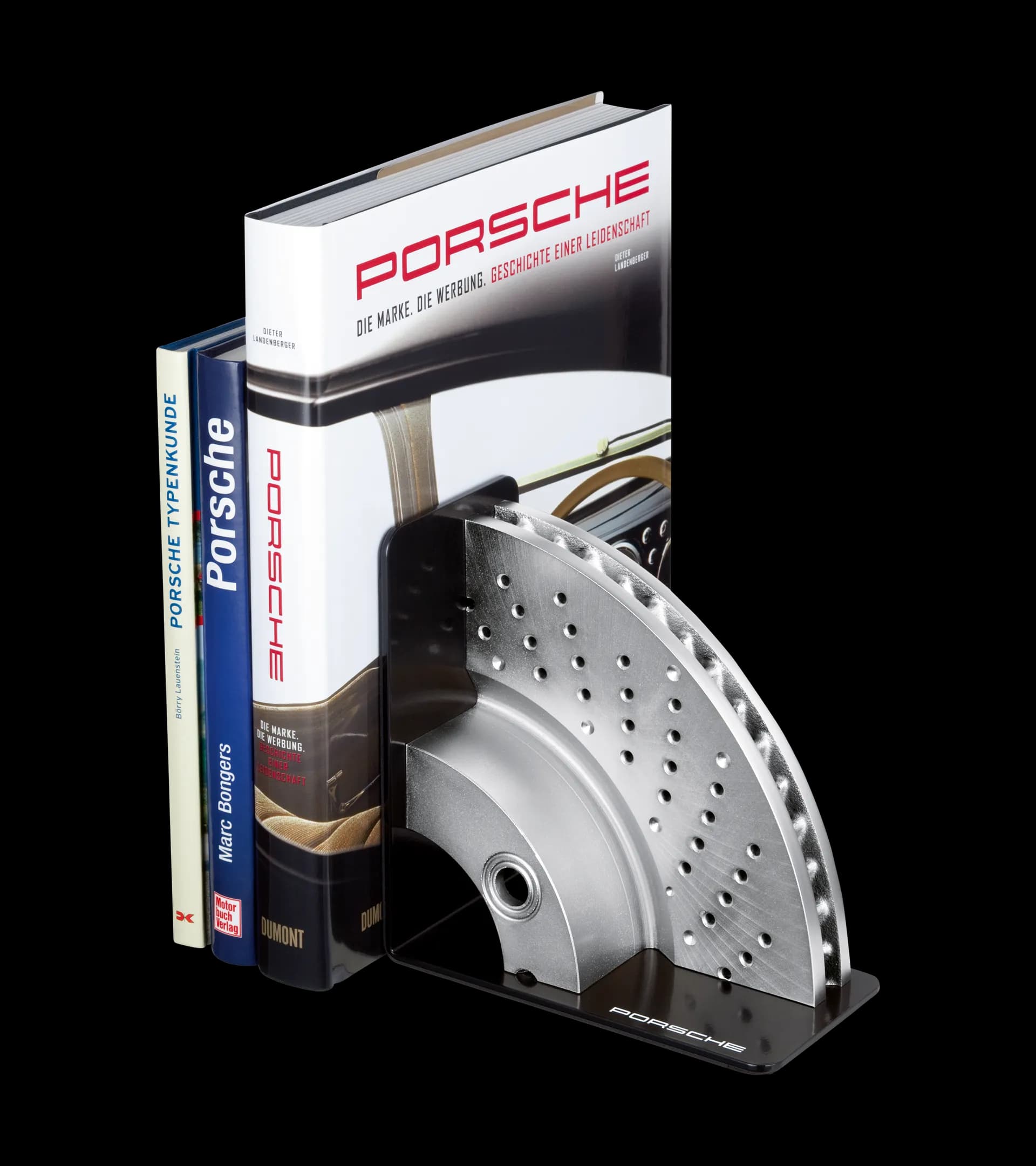 Fermalibri ispirato al disco del freno originale della Porsche 911 Carrera. Con superfici di appoggio in gomma, montato su angolare in acciaio verniciato in nero.
