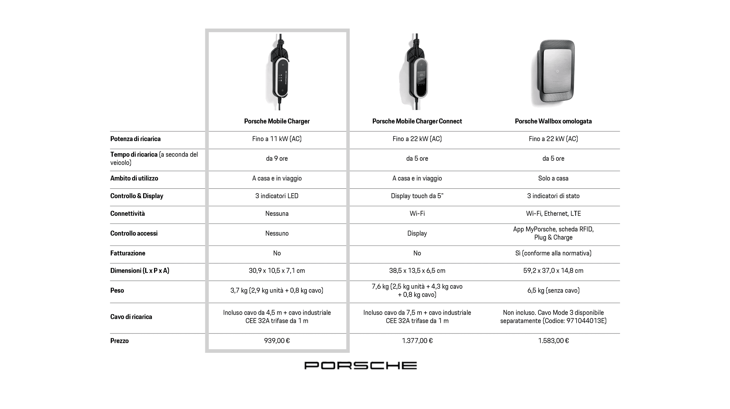 1Nota: l'equipaggiamento di ricarica Porsche è adatto esclusivamente all'uso su vetture che soddisfano i requisiti delle direttive e delle norme per veicoli elettrici. La compatibilità è garantita solo per le vetture elettriche con connettore di tipo 2. Il tempo di ricarica dipende dal modello, dall'equipaggiamento della vettura e dal rispettivo paese in cui viene ricaricata.