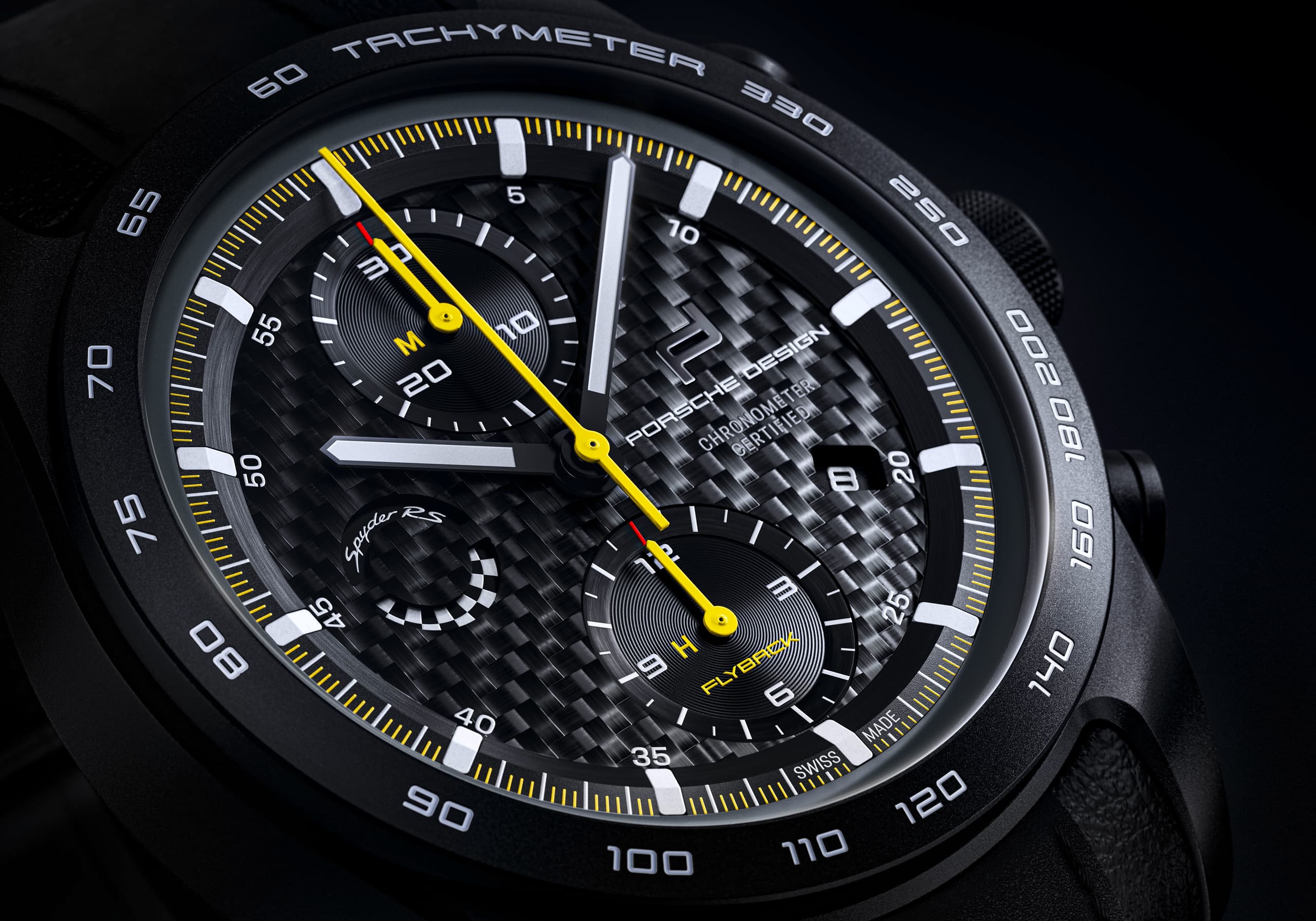 La 718 Spyder RS è progettata per la massima leggerezza e un'agilità adrenalinica. Grazie alla cassa in titanio, anche il cronografo 718 Spyder RS si distingue in leggerezza. Inoltre, il cronografo può essere personalizzato come la vettura a cui si ispira. La lunetta con indicazione dei minuti è abbinata al colore della cassa ed è disponibile in titanio naturale o titanio nero (rivestito). Anche l'anello colorato può essere personalizzato: con tutti i colori Spyder RS standard, metallici e speciali disponibili, oltre ad altri 114 "colori a scelta", tra cui numerosi colori iconici. Il quadrante in carbonio "RS" e il quadrante "GT" in nero, con scritta Flyback e una "M" e una "H" in giallo racing per i minuti e le ore, ne sottolineano ulteriormente la sportività. L'indicatore di marcia meccanico a ore 9 evidenzia il DNA sportivo tipico della 718 Spyder RS, con un design che riprende la bandiera a scacchi bianchi e neri e la scritta "Spyder RS".