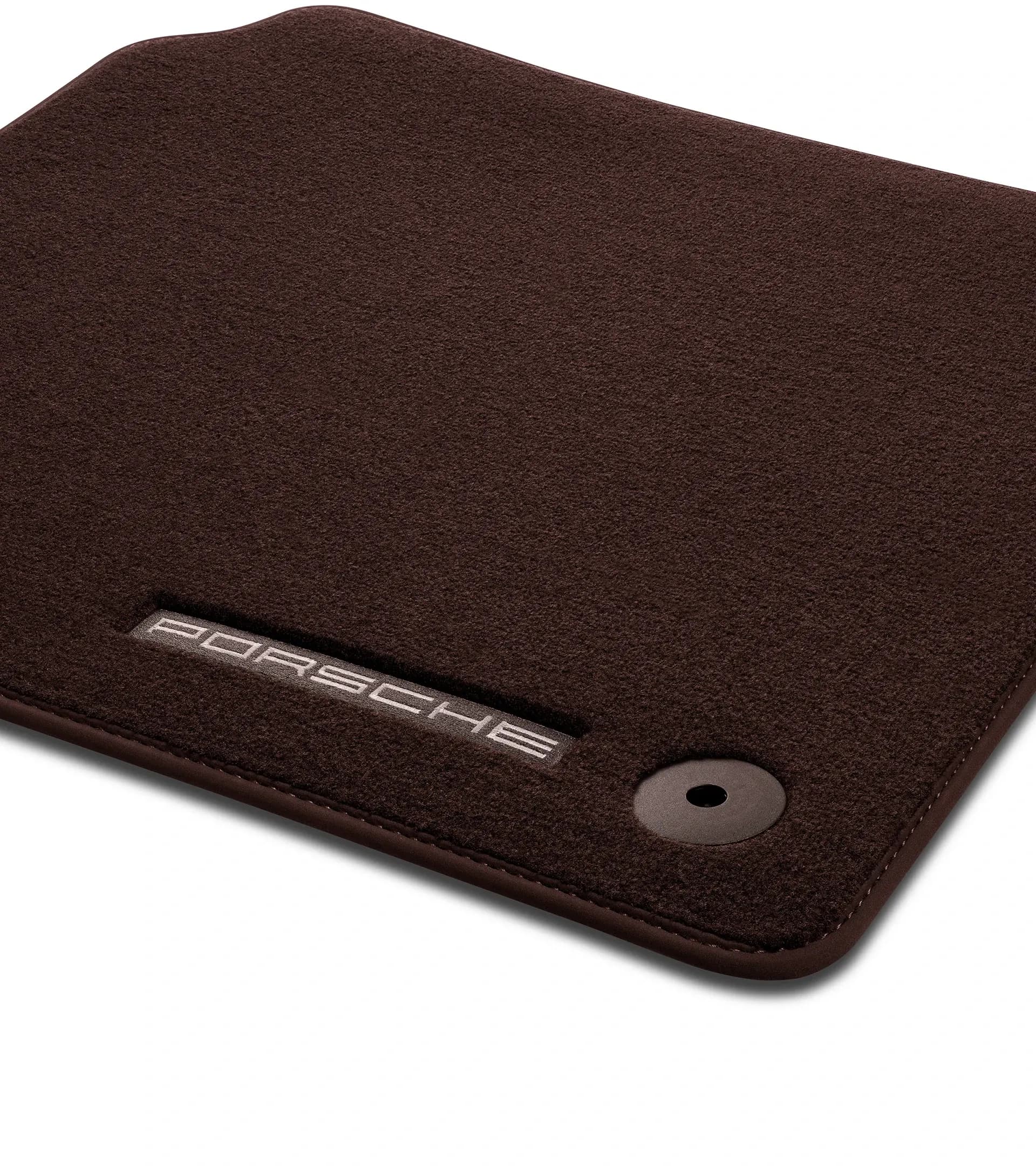Jeu de quatre pièces dans des teintes intérieures sélectionnées, gansées de nubuck, avec la signature « PORSCHE » couleur Argent en incrustation brodée.