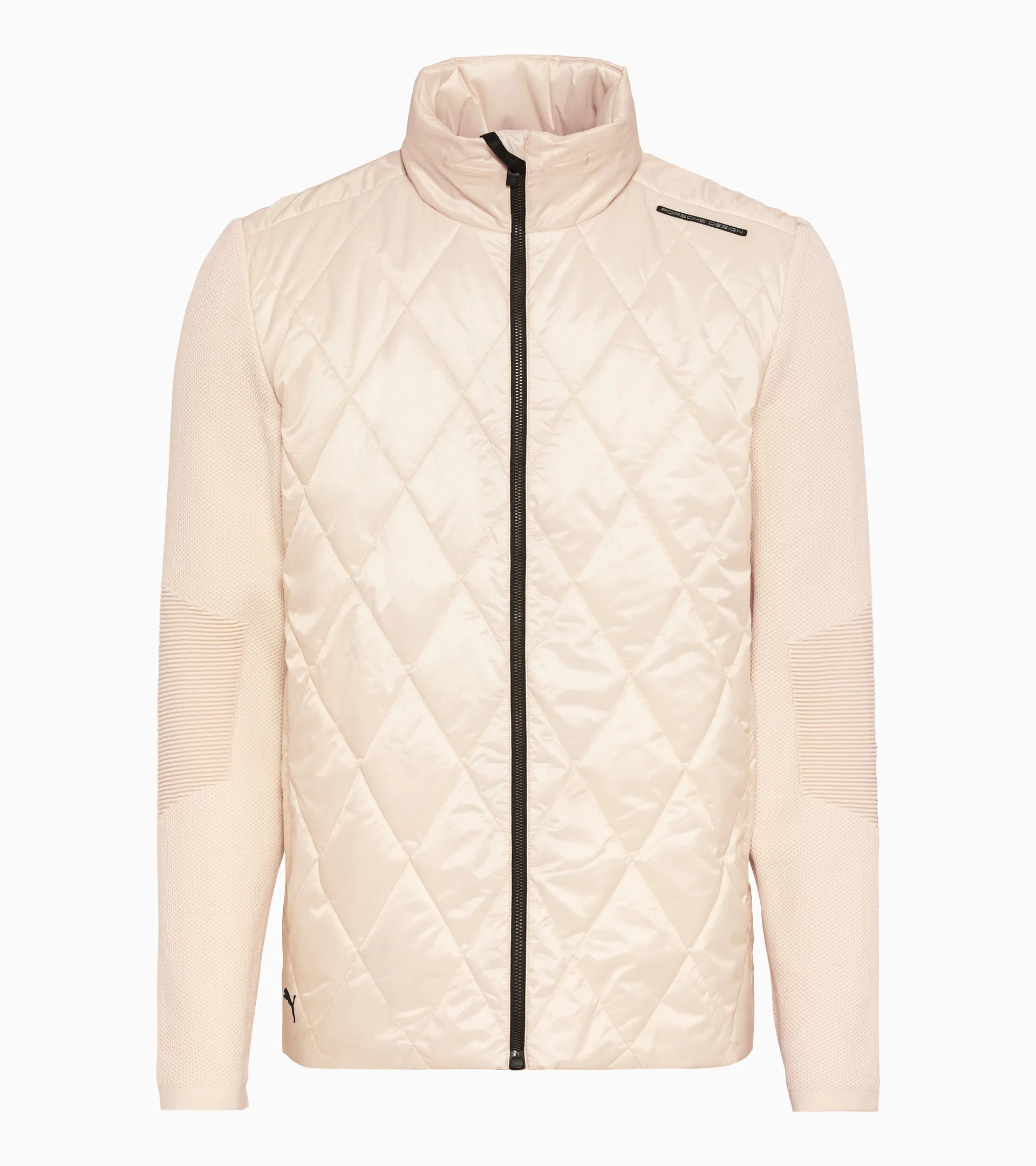 Sophisticated design meets flexibility: the sporty hybrid jacket with rainCELL® and warmCELL® technology has perfected the interplay of form and function.The EvoKNIT® technology on the sleeves ensures lightness and unhindered comfort. Recycled, water-repellent material and the stand-up collar with stowable hood and Porsche Design branding on the fastening underline the functionality. The two hip pockets with zips and inner chest pocket are ideal for smaller valuables. Thanks to the geometric quilting and the seamless knitted material, the Porsche DNA is in every fibre. The front zip with a garage for the zip puller and the Porsche Design branding tape round off the detailed design.