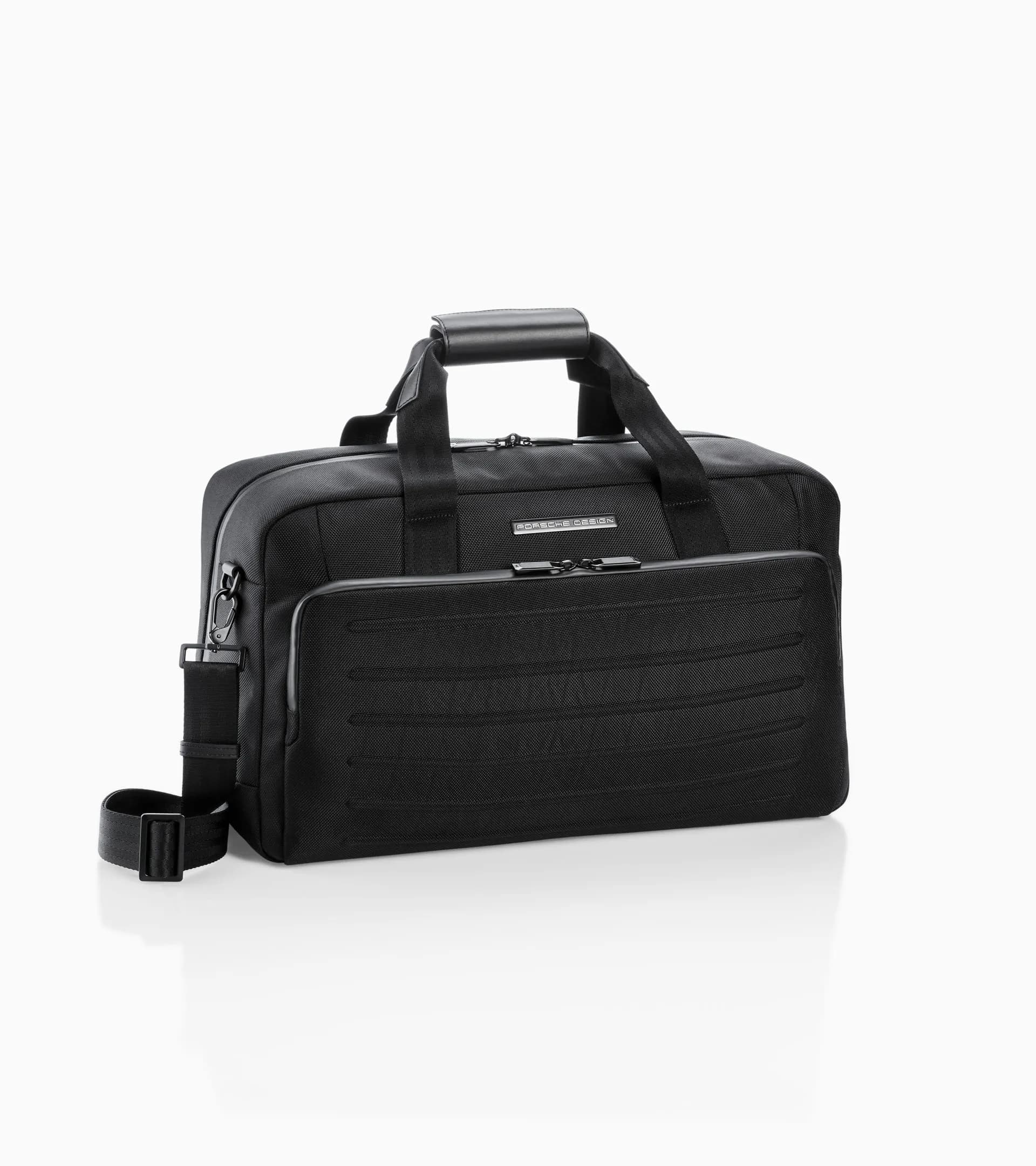 Spacious Porsche Design travel bag made from water-repellent material. With two handles, a shoulder strap and trolley link.