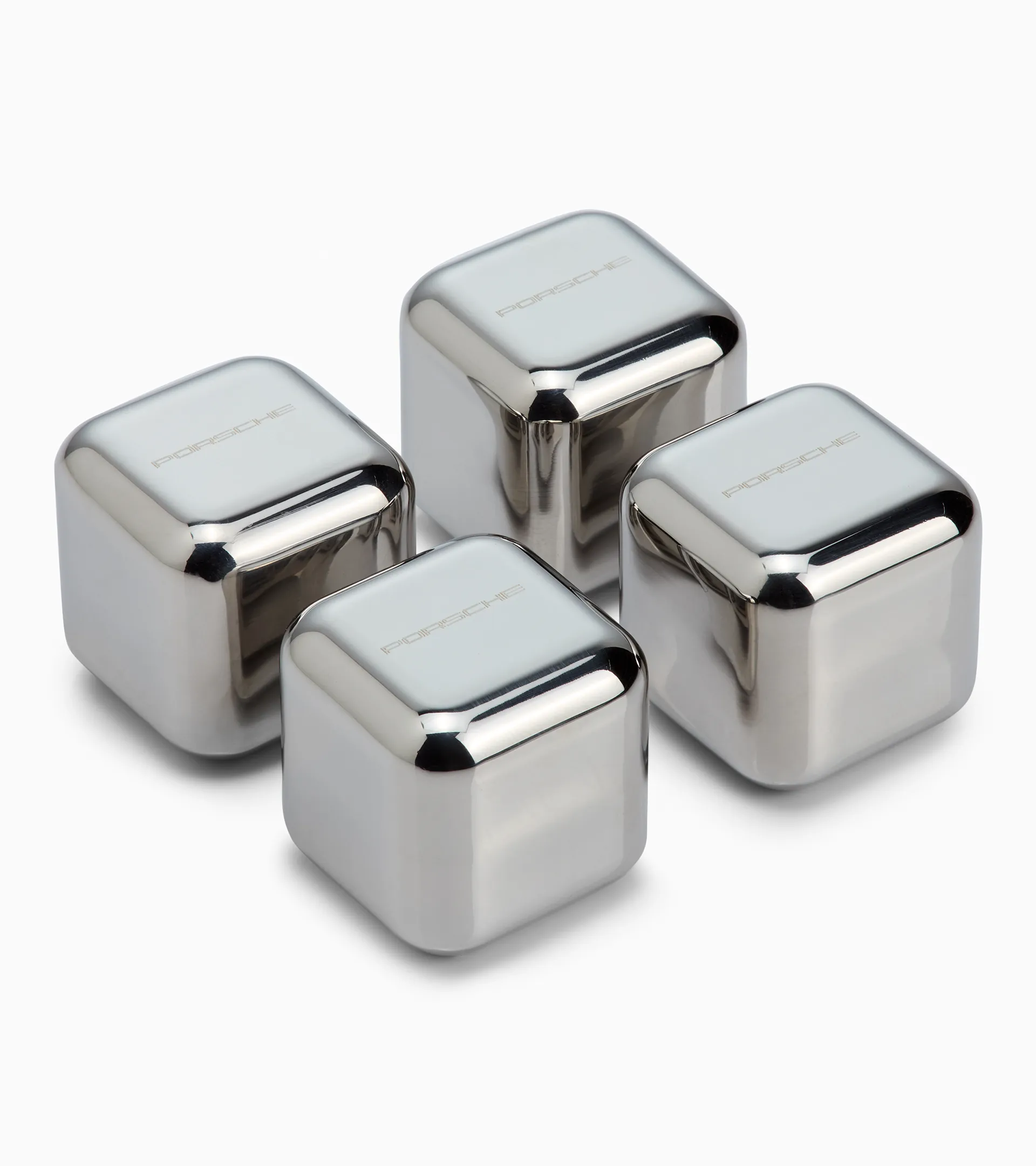 Four Porsche ice cubes made of stainless steel with laser-engraved Porsche lettering – flavour-neutral, long-lasting chill, reusable.