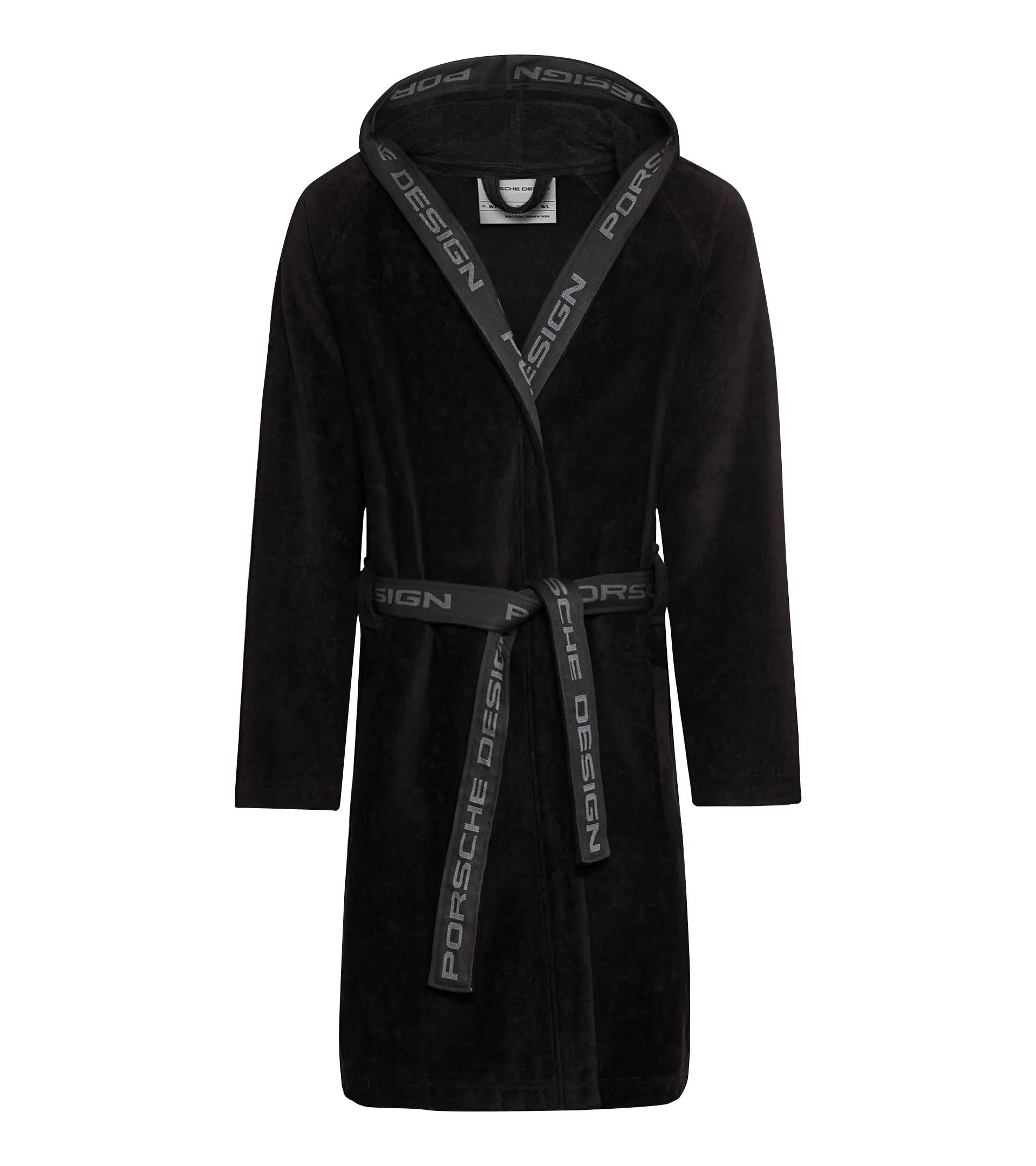 Peignoir exclusif pour hommes, arrivant aux genoux, de Porsche Design. Le peignoir design sportif en tissu éponge possède une ceinture réversible avec logo.