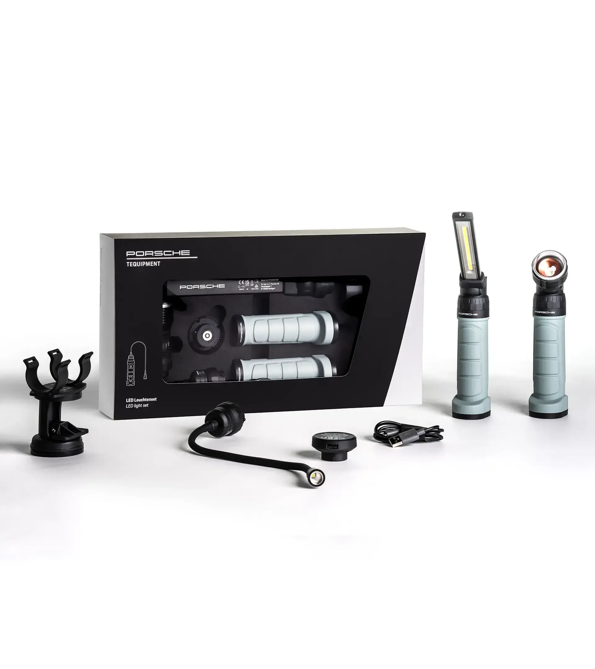 De LED-verlichtingsset van Porsche Tequipment is een echte allrounder: dankzij verschillende module-opzetstukken heeft u altijd de ideale verlichting bij de hand – of het nu gaat om inspectieverlichting voor werkplaatswerk of als zaklamp op de volgende kampeertrip.