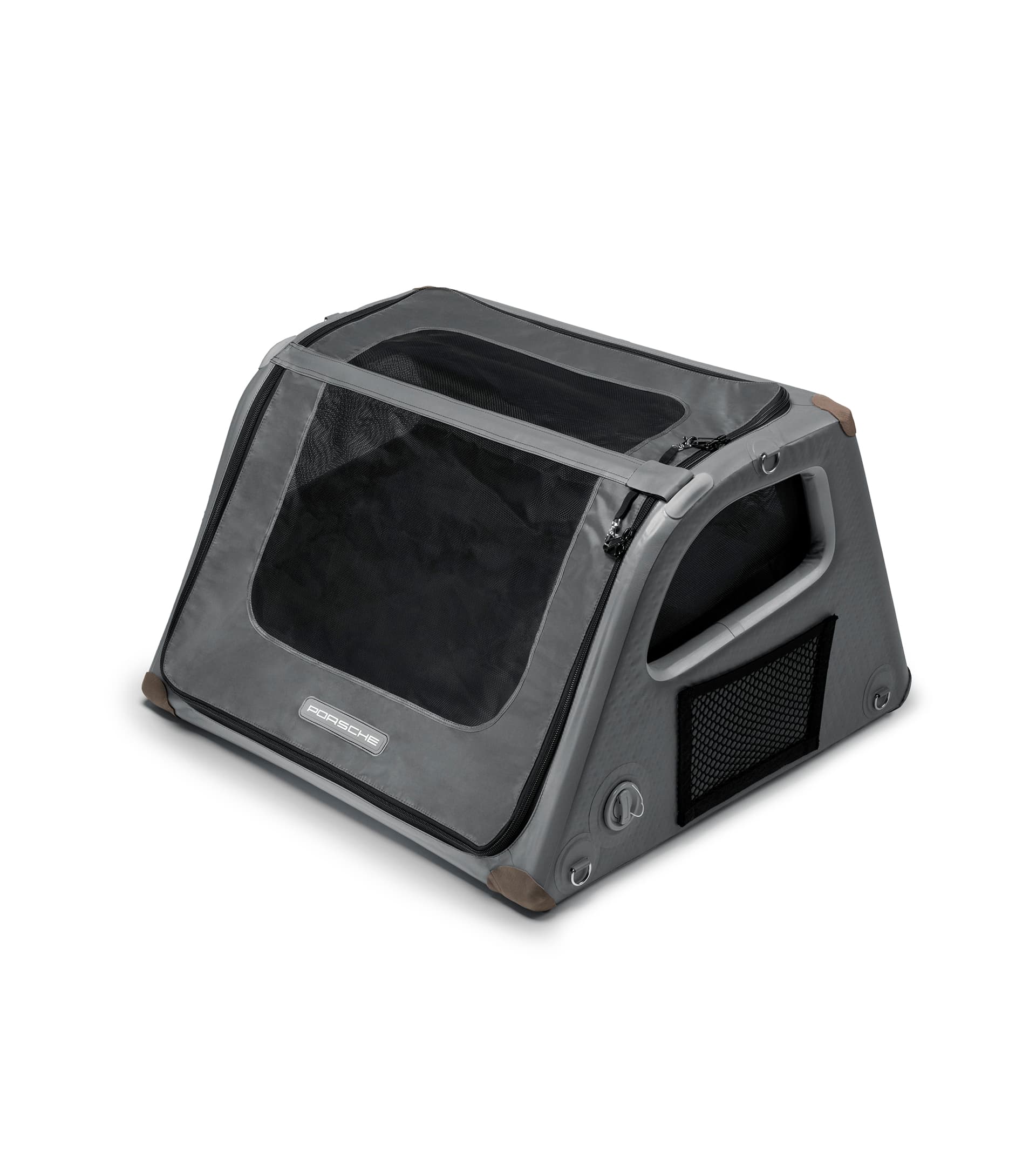 Okienka transportera są wykonane z prześwitującej siateczki, która zapewnia dobrą wentylację. Jedno z okienek znajduje się z tyłu, co umożliwia zwierzęciu zaglądanie do wnętrza pojazdu. Solidne zamki błyskawiczne można zablokować, aby pies nie mógł ich otworzyć. Transporter ma od spodu uchwyt do przenoszenia, a ramy okienek służą za dodatkowe uchwyty.
