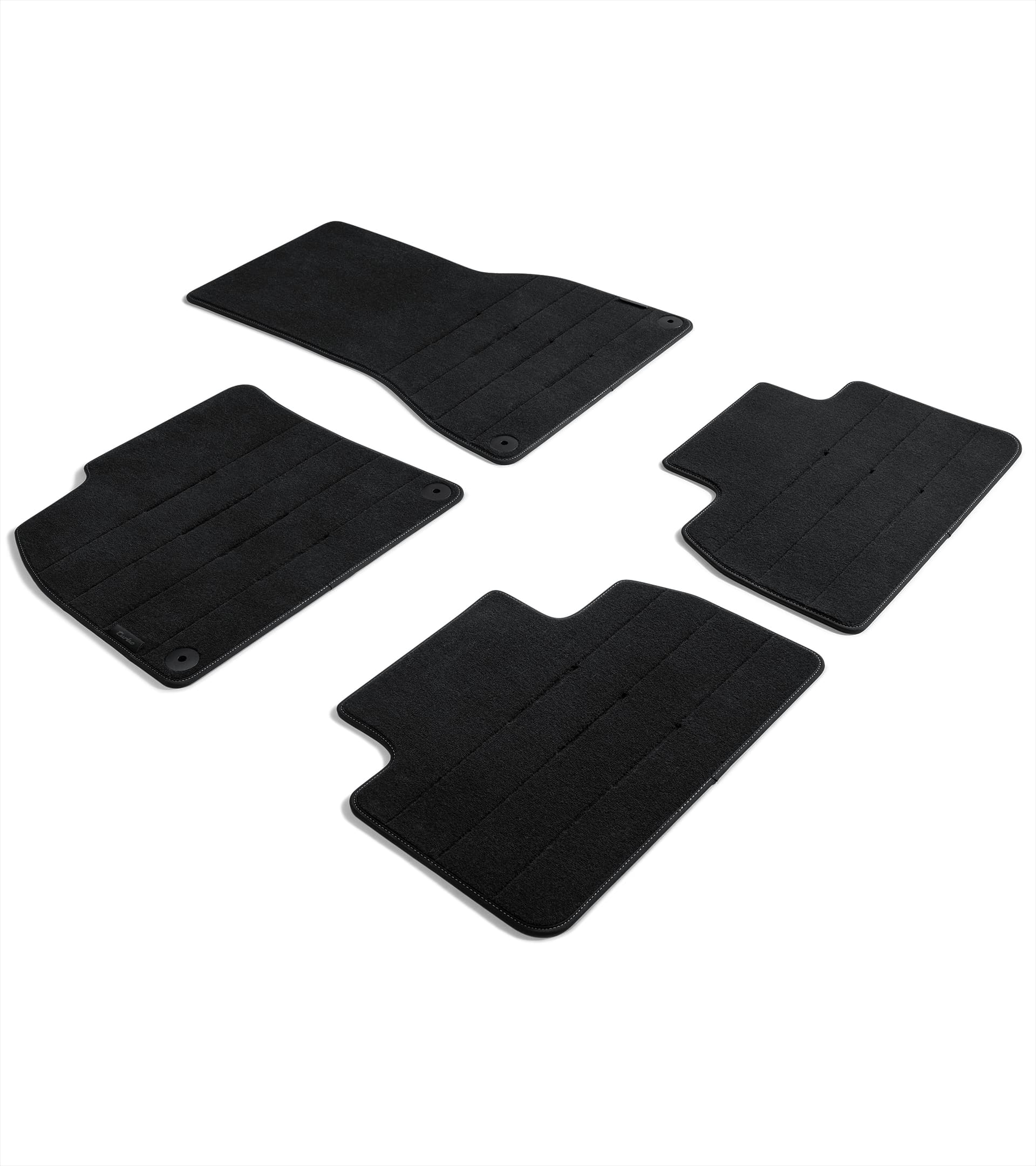 Czteroczęściowy zestaw mat podłogowych skutecznie chroni wnętrze Macana Electric Turbo przed zabrudzeniami i wilgocią. Wysokiej jakości obszycie ze skóry nubukowej i tłoczenia charakterystyczne dla stylistyki turbo nadają matom atrakcyjny wygląd. Ekskluzywny kolor turbonit jest elementem wyróżniającym nową stylistykę turbo: w tym kontrastowym kolorze są wykonane przeszycia ozdobne. Precyzyjnie dopasowane, czarne maty podłogowe zapewniają niezawodną ochronę oryginalnych dywaników i można je łatwo wyjąć z pojazdu w celu czyszczenia.