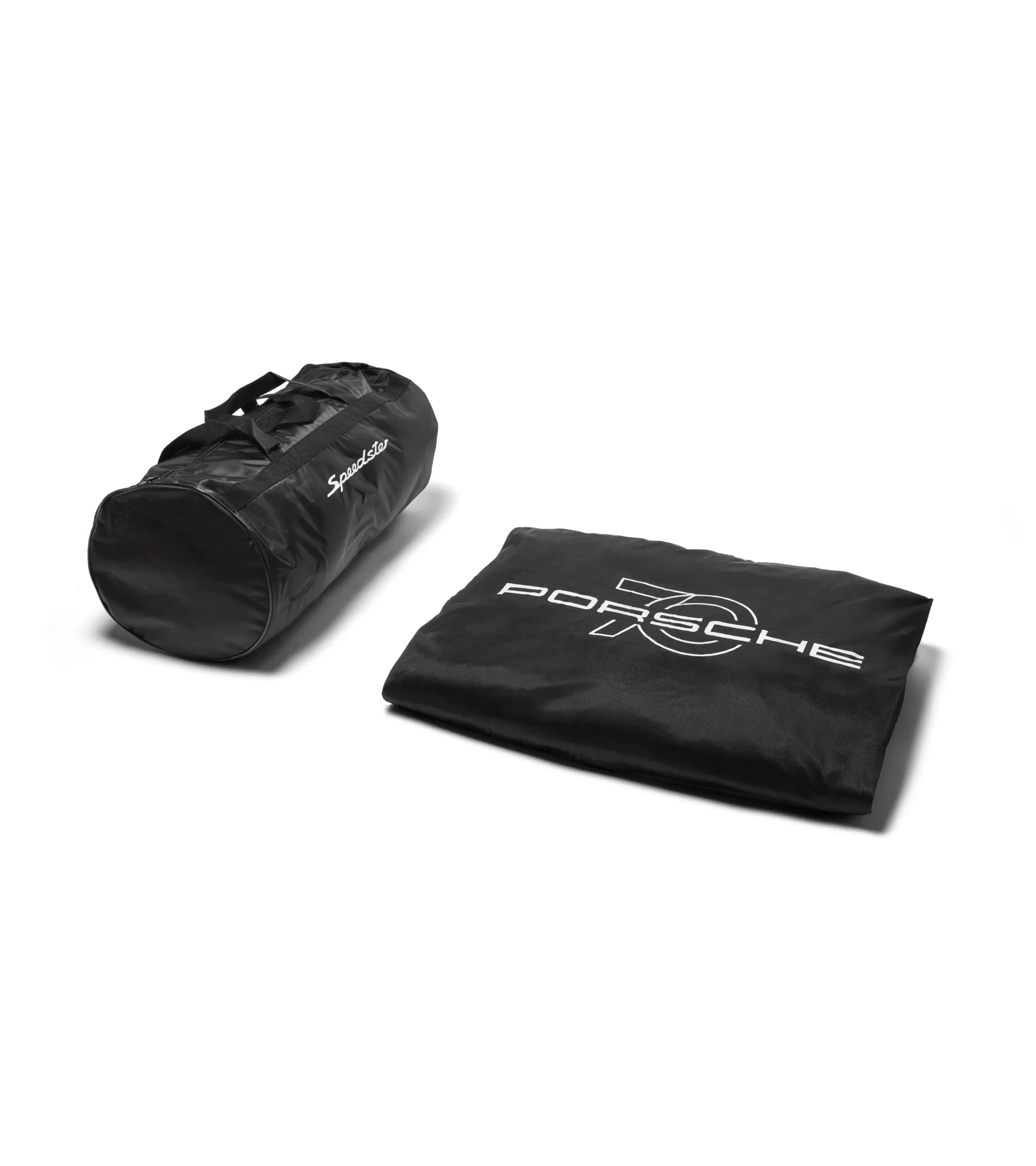 Dopasowany czarny pokrowiec na samochód do użytku w pomieszczeniach, wykonany z oddychającego, antystatycznego i odpornego na zabrudzenia materiału. W stylistyce „70 lat Porsche” z lamówką, napisem „Speedster” z boku i srebrnym logo „Porsche 70”.