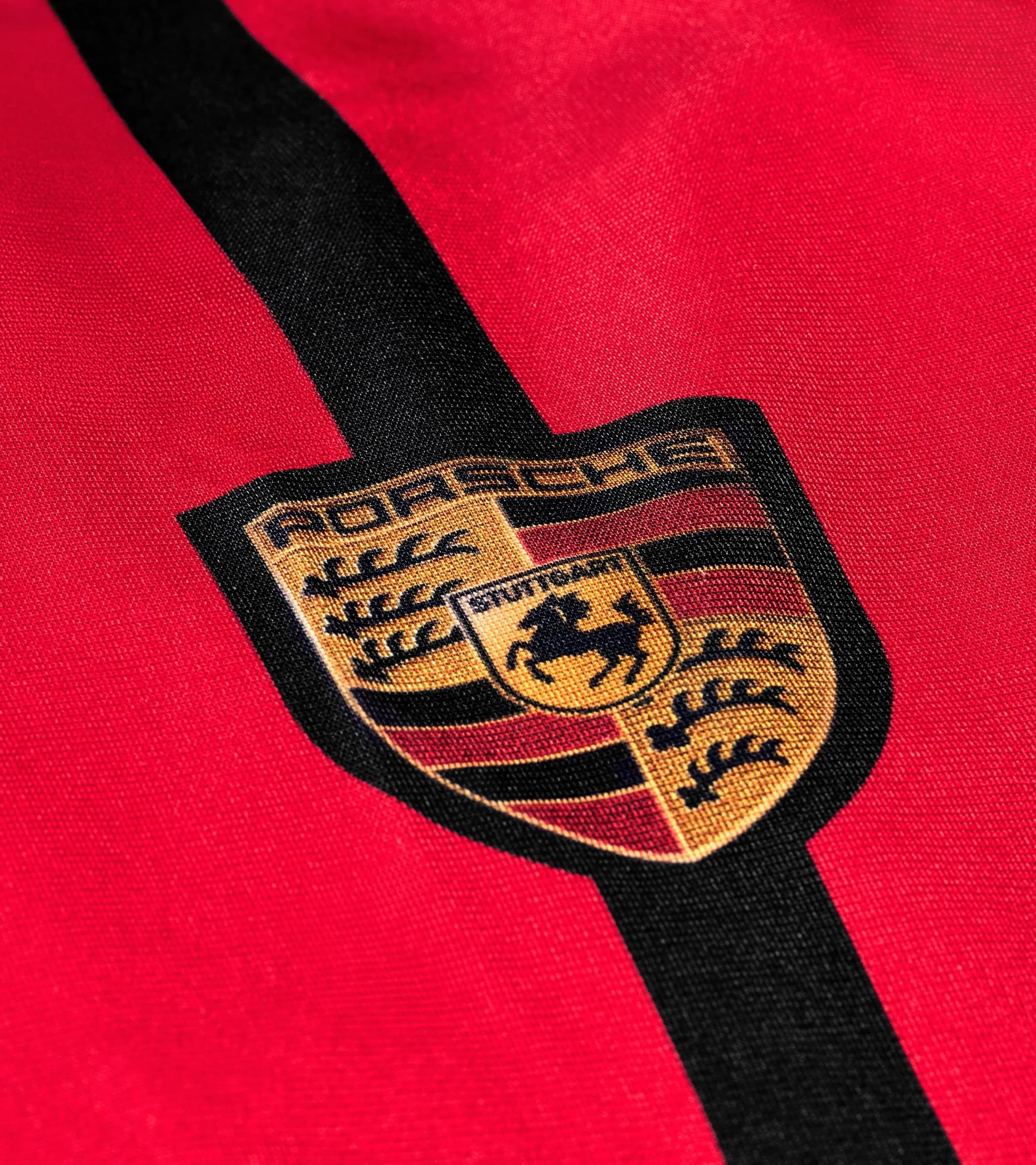 Dopasowany pokrowiec na samochód do użytku w pomieszczeniach, wykonany z oddychającego, antystatycznego i odpornego na zabrudzenia materiału. Szyty ręcznie z kontrastową lamówką, ozdobnymi paskami, napisem „PORSCHE” i kolorowym herbem Porsche. Czarna tkanina wykonana jest w 100% z poliestru i można ją prać w temperaturze 30° C.