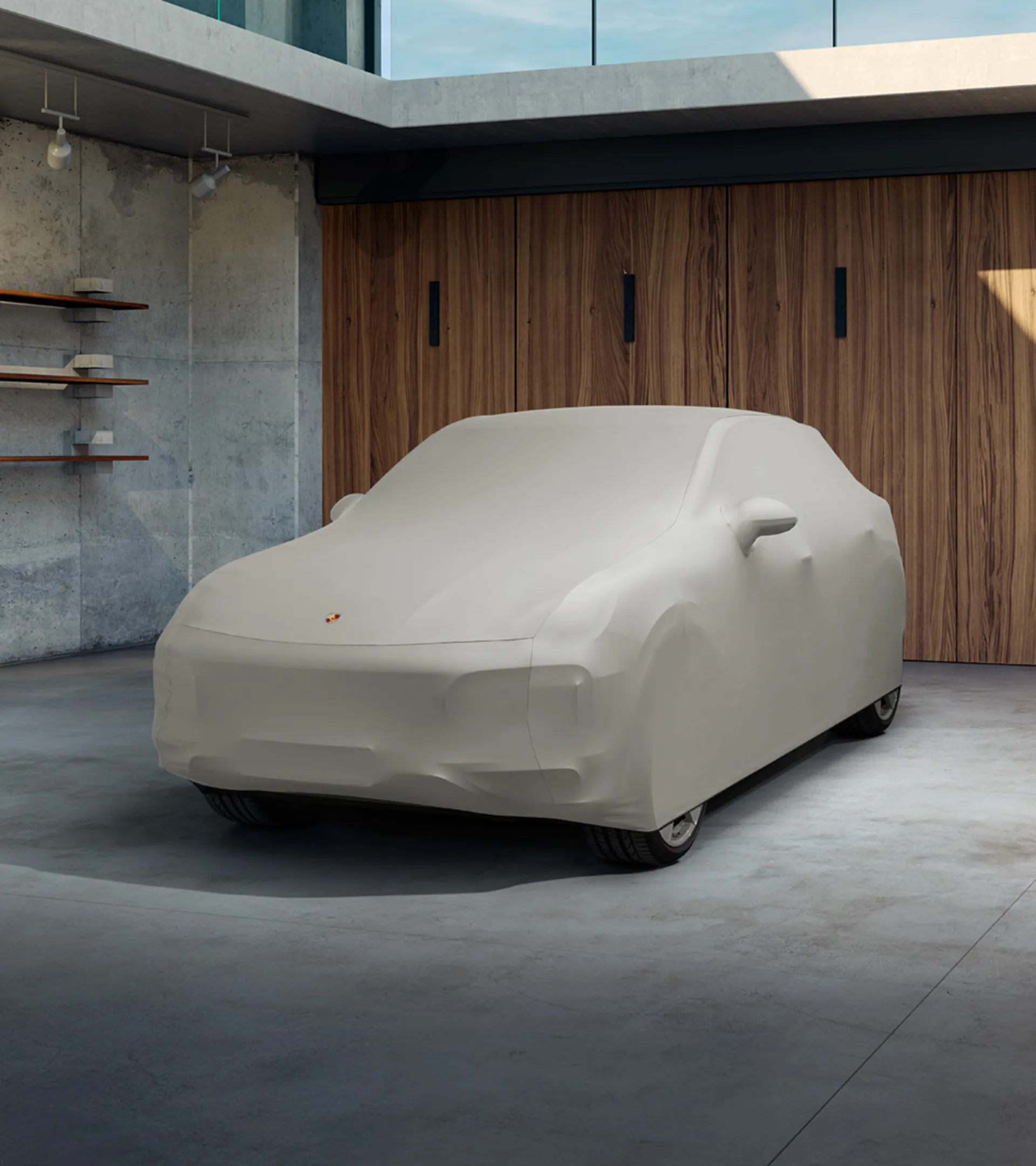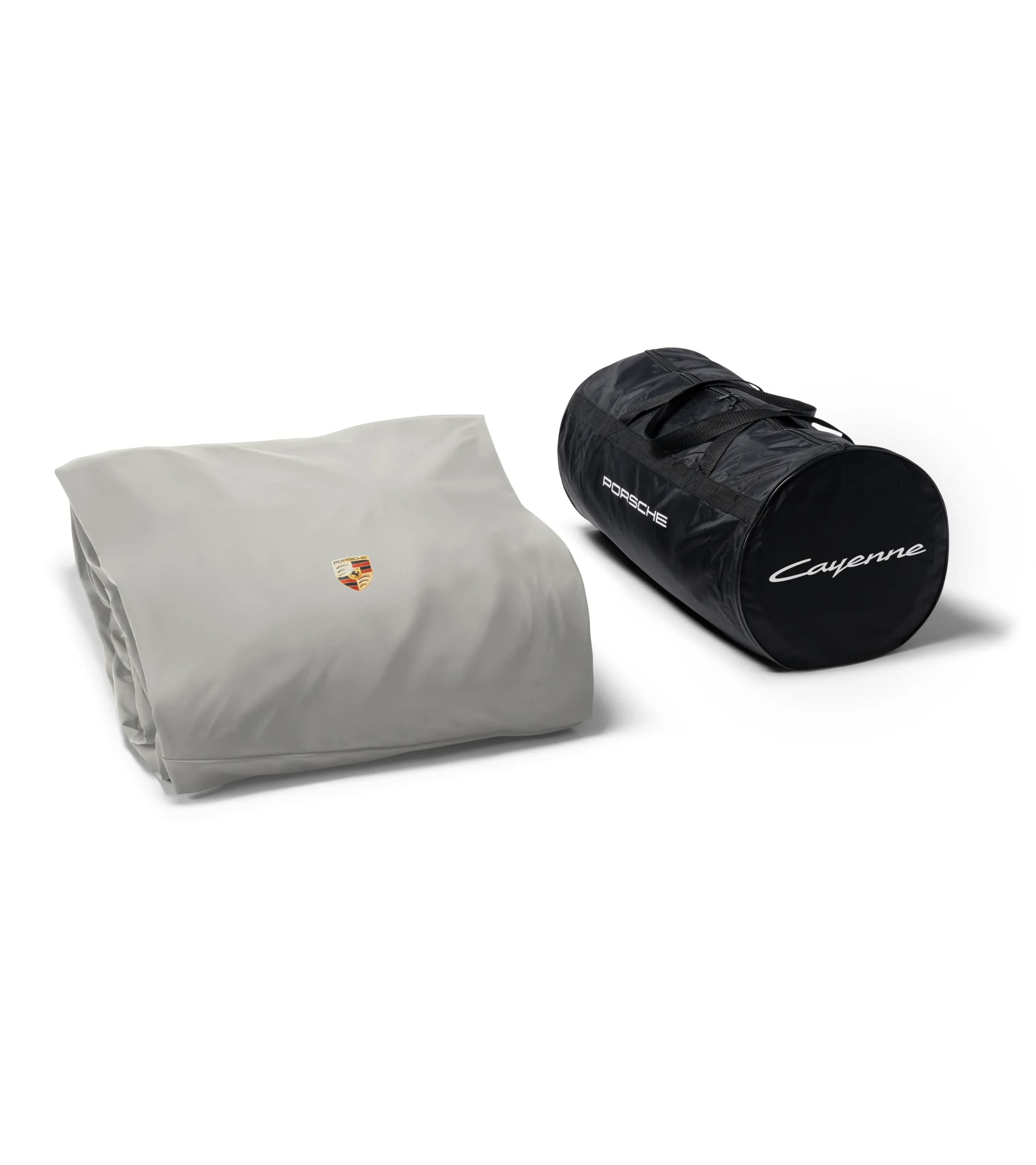 Precyzyjnie dopasowany pokrowiec zewnętrzny na samochód w kolorze beżowym z kolorowym emblematem Porsche. Wykonany z oddychającego i wodoodpornego materiału z zabezpieczeniem przed kradzieżą.