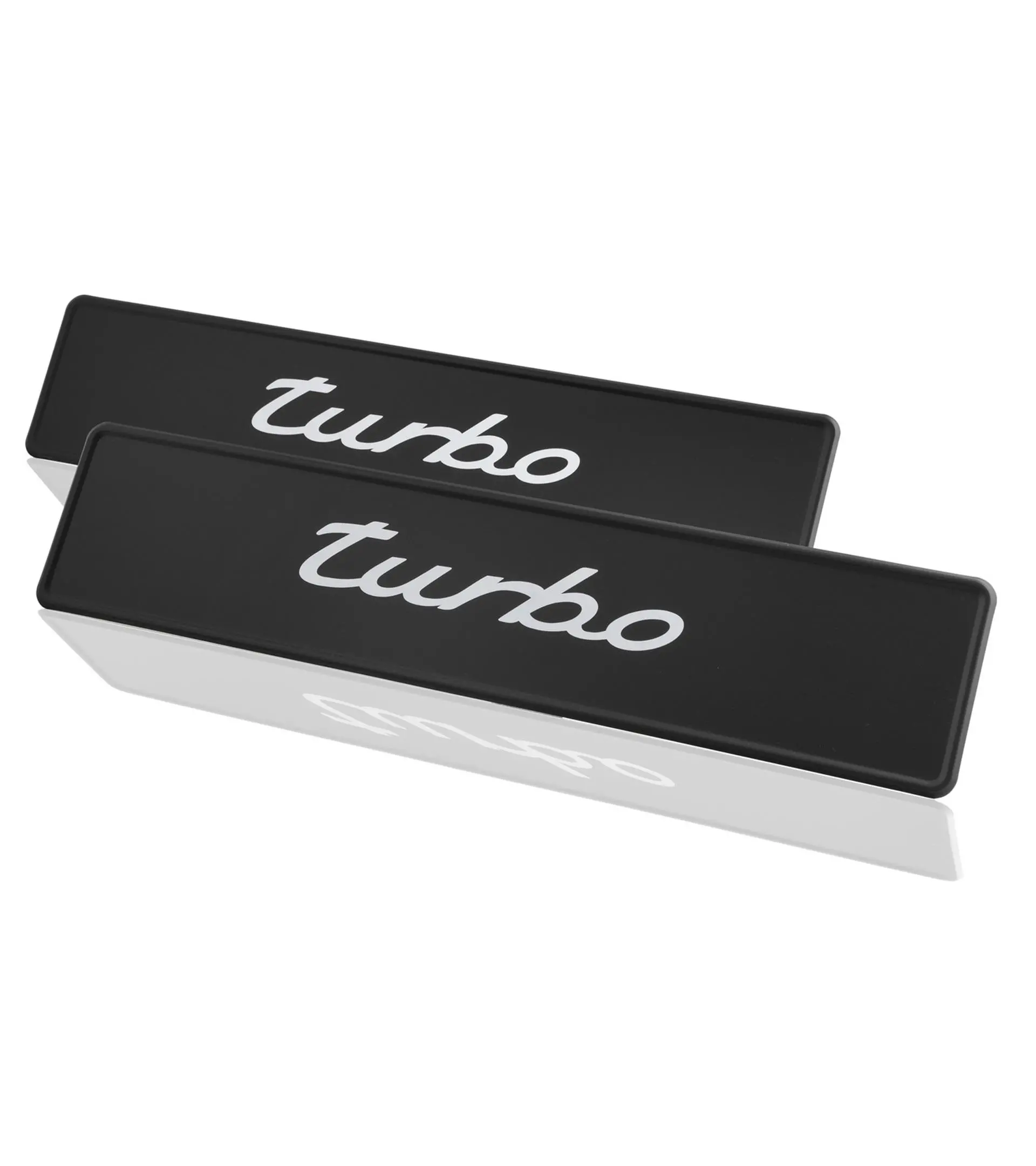 Czarna tablica rejestracyjna z białym nadrukiem „Turbo” o wymiarach 11 x 52 cm; nadaje się do wszystkich modeli Porsche Turbo. Zawartość: 2 sztuki.
