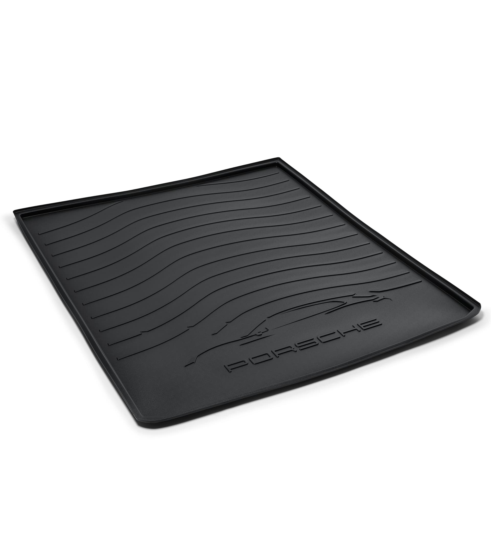 Dokładnie dopasowana wanna ochronna w kolorze czarnym z sylwetką pojazdu i z logo „PORSCHE”. Nieprzepuszczająca wody i nadająca się do mycia.