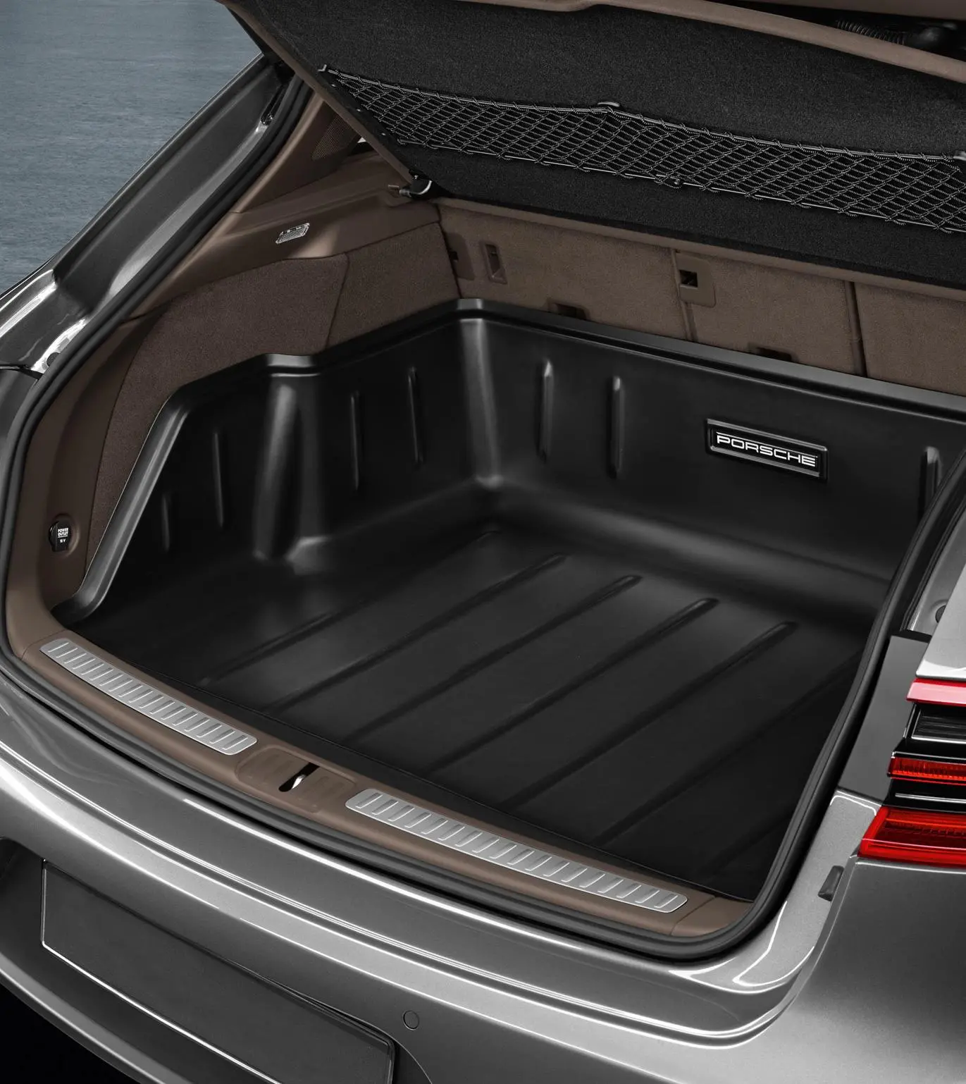 Dokładnie dopasowana wanna ochronna z logo „PORSCHE”. Nieprzepuszczająca wody i nadająca się do mycia.