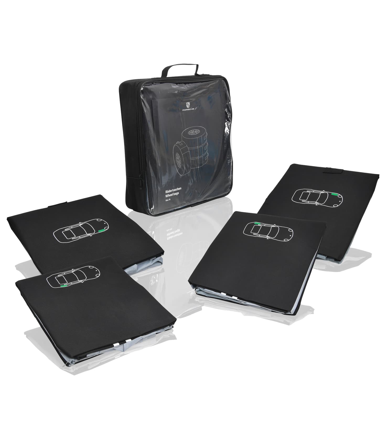 Do przechowywania w schludny sposób kompletnych kół: pokrowce na koła Porsche (rozmiar XL) w zestawie 4 sztuk, do opon o rozmiarach 17-21 cali (obwód opon od 2071 do 2310 mm i średnica od 661 do 735 mm).