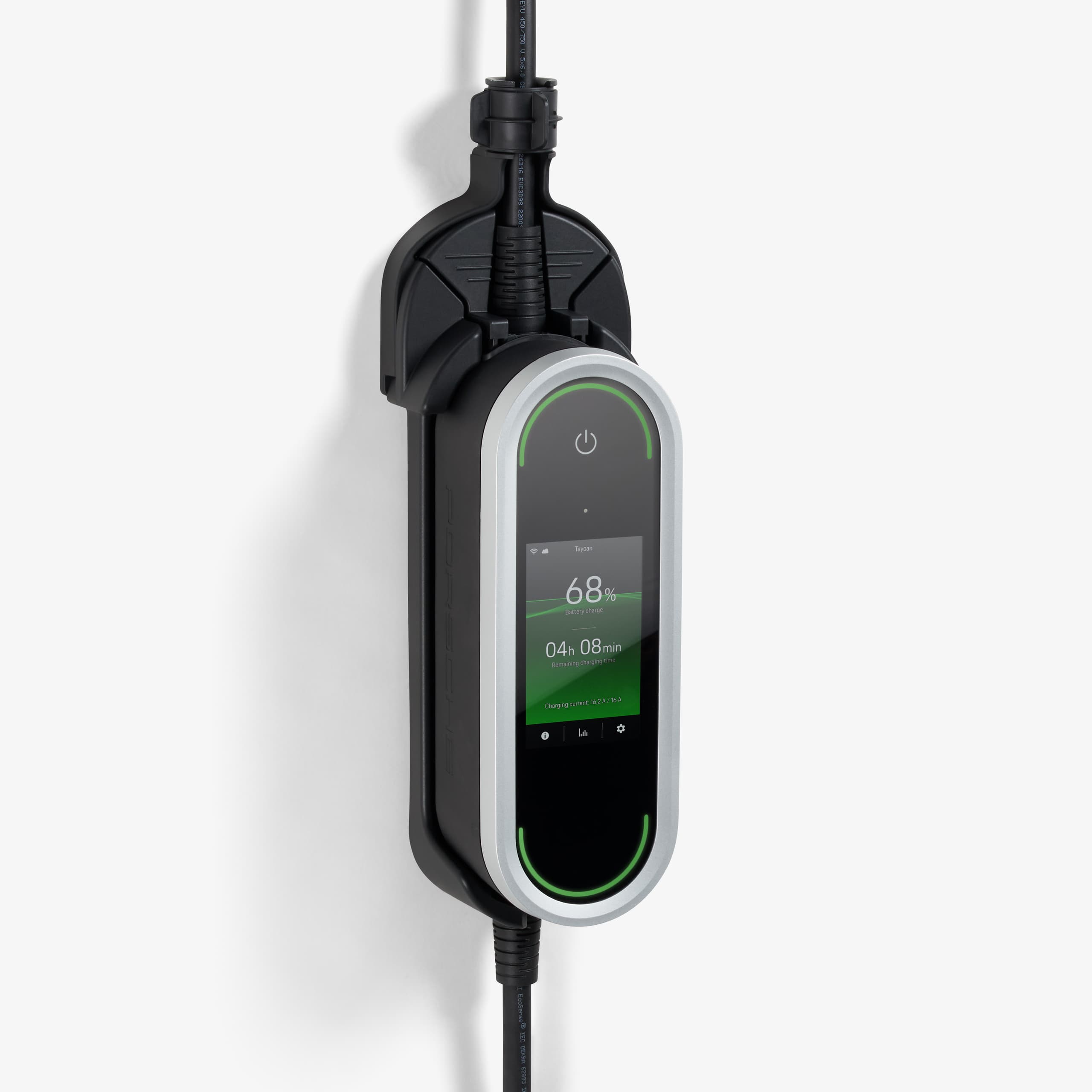 O Porsche Mobile Charger oferece a possibilidade de carregar até 11 kW, tanto em viagem como em casa, podendo ser instalado, se necessário, na parede da garagem em casa com o suporte de parede disponível opcionalmente.