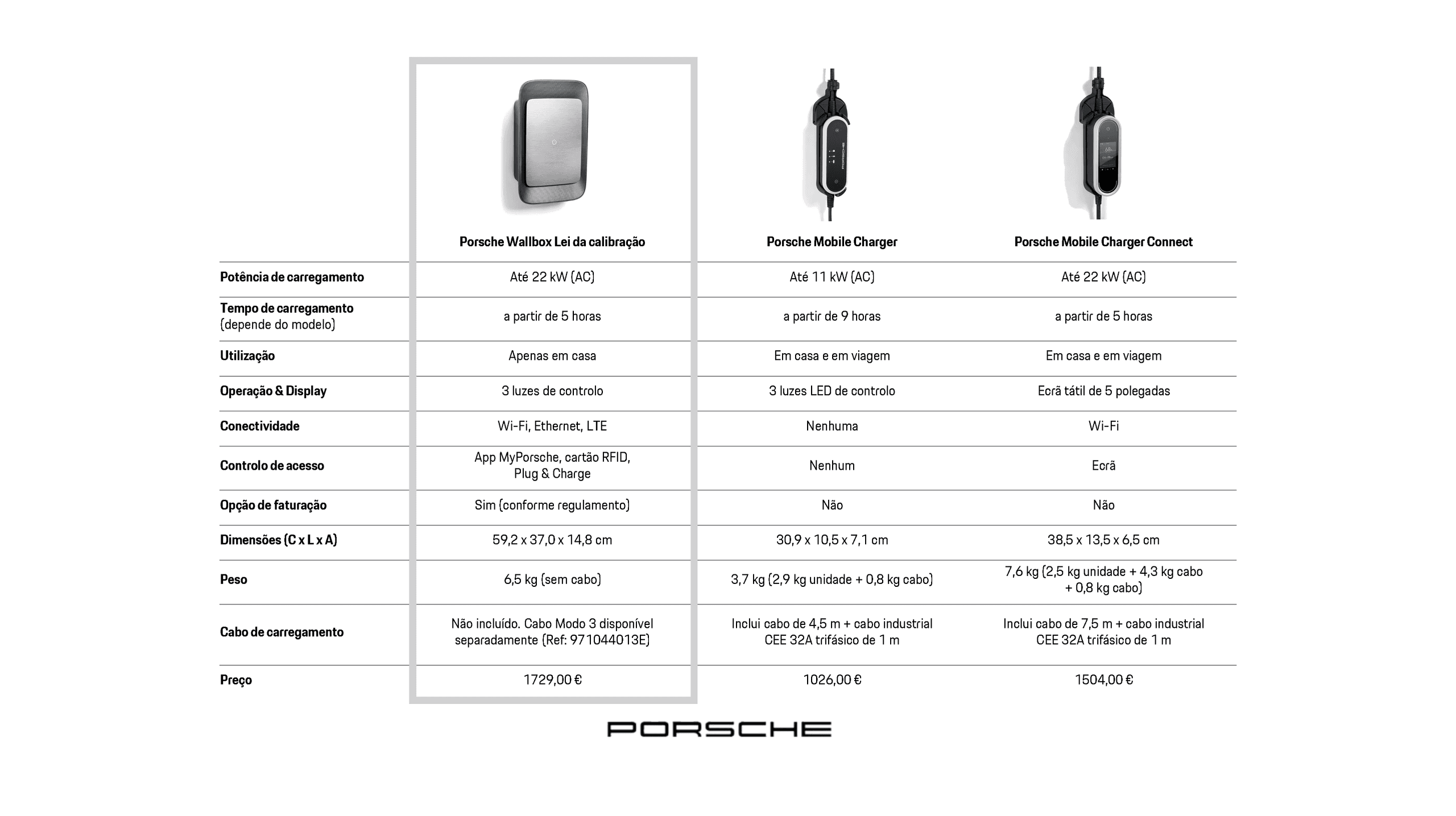 1Nota: o equipamento de carregamento Porsche só é adequado para utilização em veículos que cumpram as normas e diretrizes geralmente aplicáveis a veículos elétricos. A compatibilidade só é garantida para veículos eletrificados com uma tomada do tipo 2. O tempo de carregamento depende do modelo do veículo, do equipamento do veículo e do respetivo país em que o veículo é carregado.