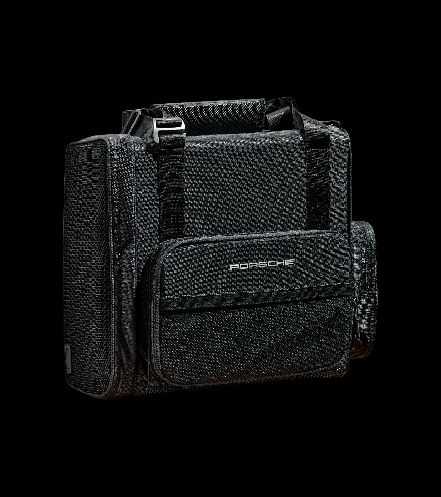 Mala térmica em Preto com um volume de aprox. 14 litros e inscrição "PORSCHE". Com ligação de 12 V para refrigerar bebidas e alimentos no veículo. Para o transporte seguro, a mala térmica pode ser fixada no banco traseiro com o cinto de segurança do veículo.