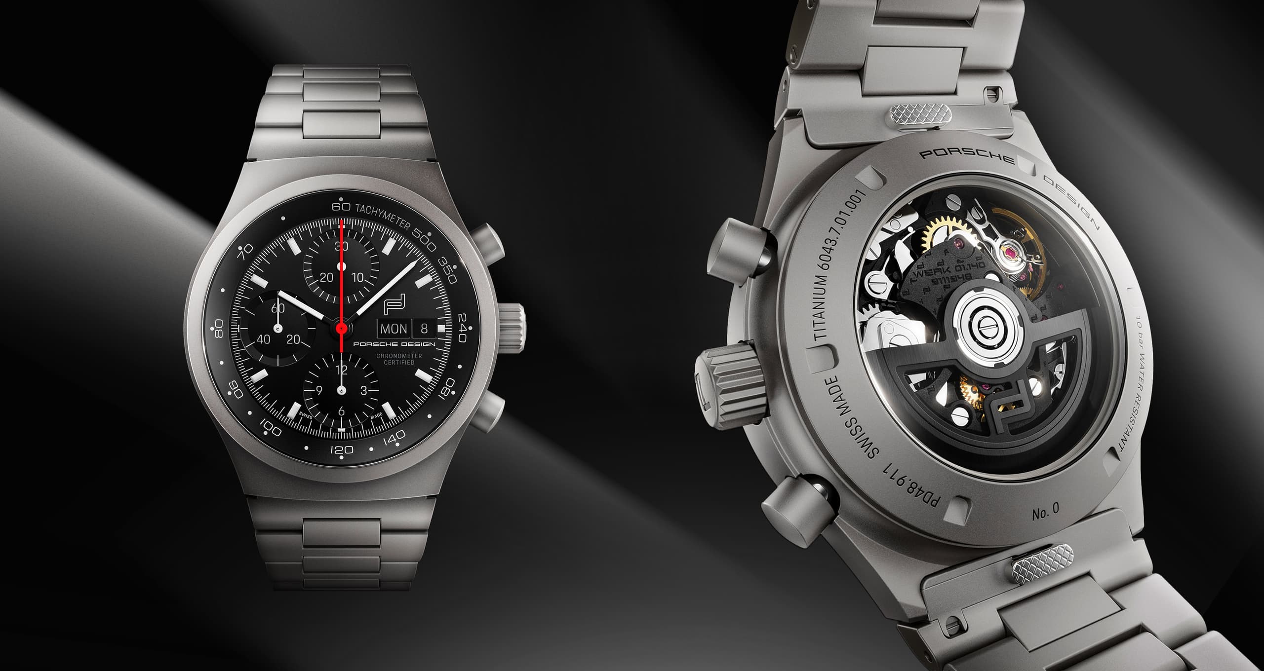 O Chronograph 1 – All Titanium Numbered Edition dá continuidade a esta filosofia de design : com uma caixa de titânio polida com jato de esferas de vidro. Detalhes selecionados, como o logótipo da Porsche Design e a inscrição "Chronometer Certified" em Cool Gray no mostrador, criam detalhes únicos. Fabricado por mestres artesãos na nova fábrica de relógios da Porsche em Grenchen, na Suíça. Edição limitada a, no máximo, 1000 exemplares por ano em todo o mundo. Completamente novo – e, no entanto, já é um clássico.