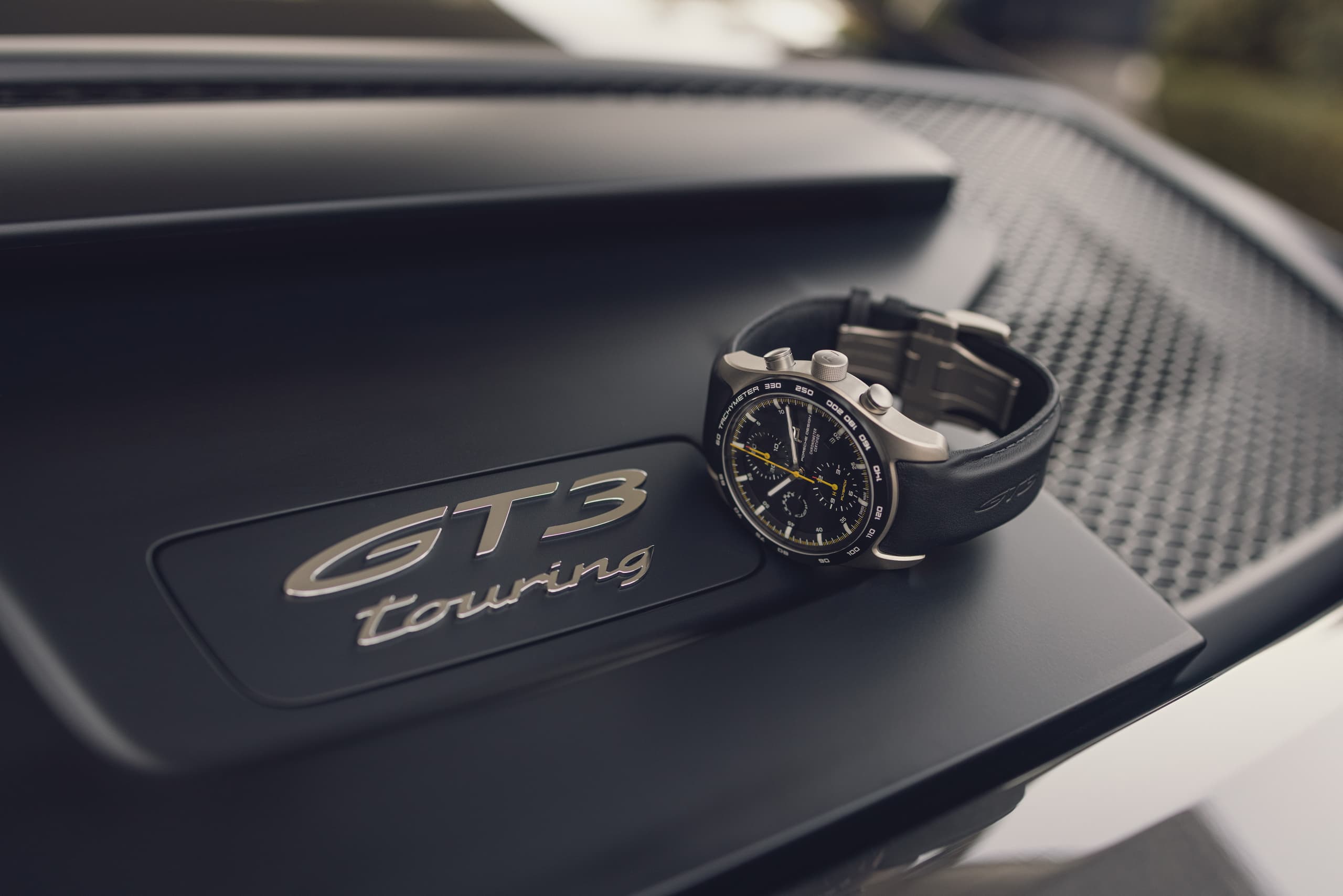 O 911 GT3 com pacote touring é um território muito próprio: a estrada, idealmente um terreno repleto de desafios sinuosos. Mas a sensação única da Porsche não se aprecia apenas nas serpentinas e nas curvas em S deste mundo: com o cronógrafo 911 GT3 com pacote touring, poderá experimentá-lo onde quer que se encontre. Exclusivamente para proprietários do Porsche 911 GT3 e do Porsche 911 GT3 com pacote touring.