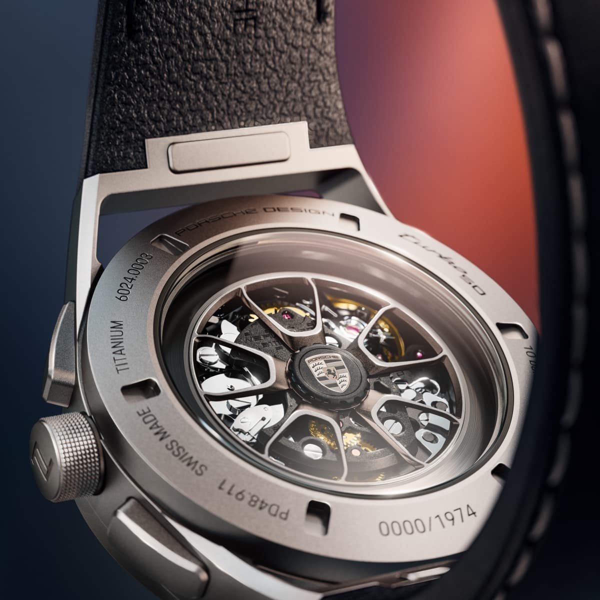 As semelhanças entre o Cronógrafo 911 Turbo 50 anos e o modelo especial de alta performance também podem ser vistas na parte de trás do relógio: com o rotor de corda ao estilo da jante do 911 Turbo 50 anos com acabamento bicolor. A jante, propriamente dita, tem um acabamento em Turbonite, enquanto os raios são acentuados em Cinzento Antracite. A tampa do rotor com o escudo Porsche em Turbonite quase faz esquecer a passagem do tempo na parte da frente do cronógrafo. Graças ao calibre de cronógrafo Porsche Design WERK 01.200 com função flyback e certificação COSC, cada segundo é exibido com a máxima precisão.
