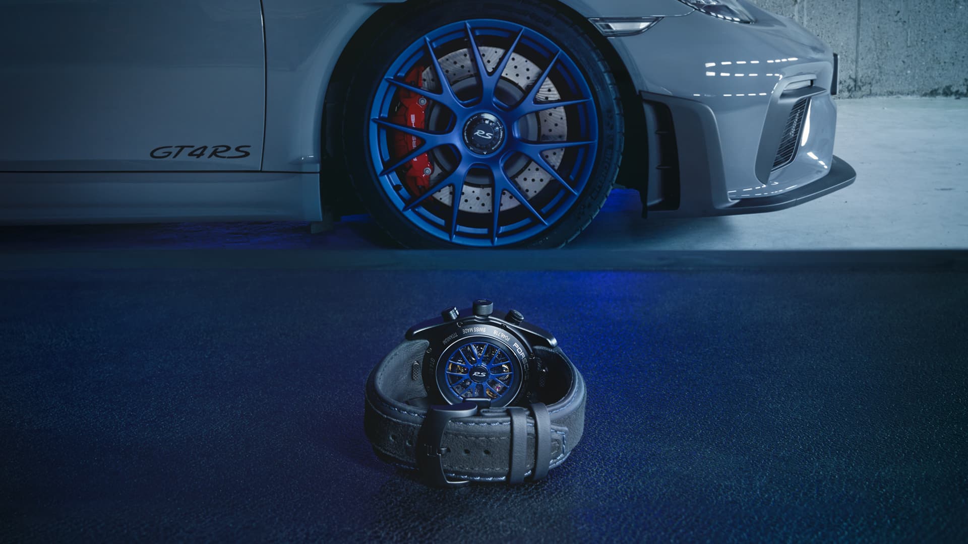 Para o veículo 718 Cayman GT4 RS foram utilizados componentes que além de serem extremamente resistentes são também leves. Este princípio de construção leve com carácter de alto desempenho reflete-se também no cronógrafo 718 Cayman GT4 RS de caixa em titânio. O mostrador em preto mate, os ponteiros amarelos dos segundos de cronometragem e do contador inspiram-se no taquímetro do veículo desportivo GT. O anel de cor apresenta-se em cinzento ártico. A bracelete com estampa "GT4 RS" é de pele genuína de veículos Porsche combinada com microfibra Race-Tex desportiva.