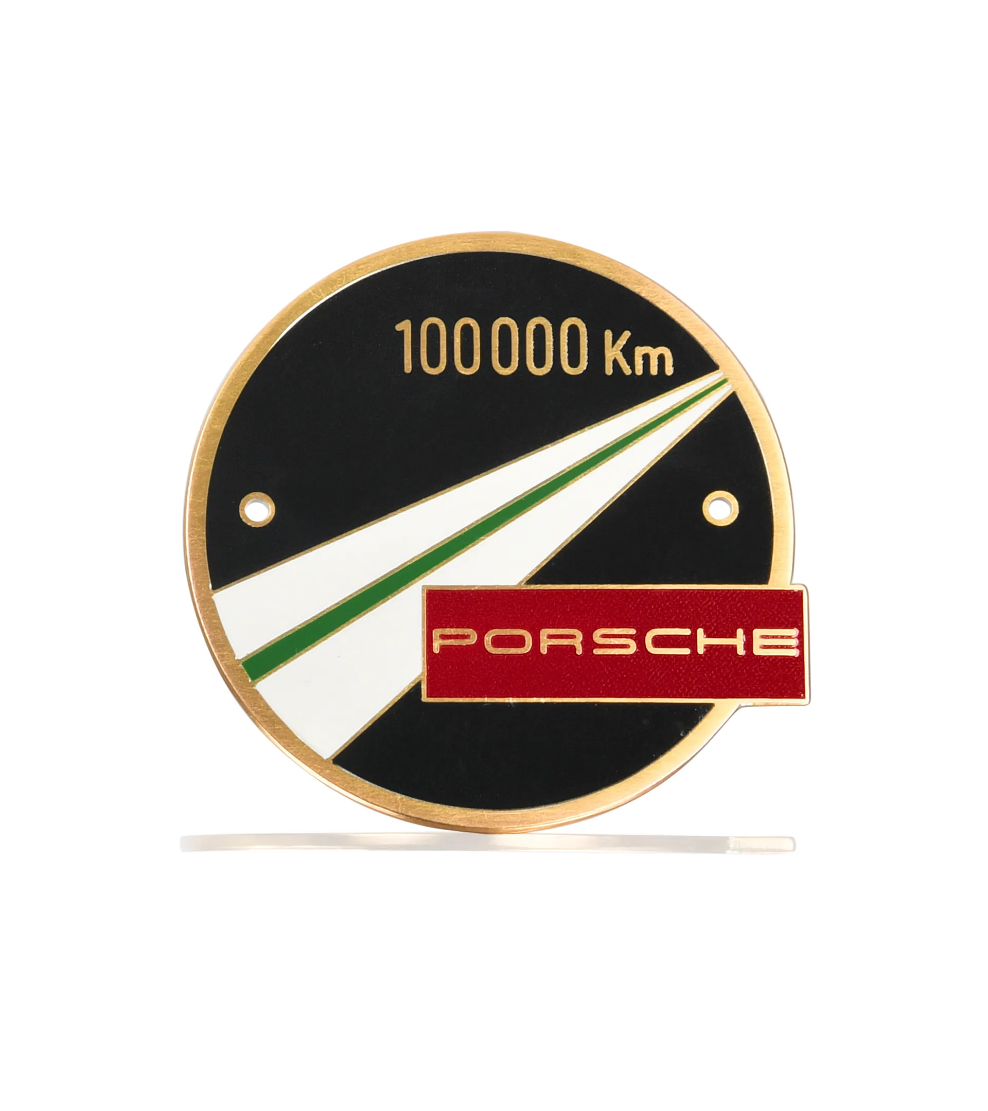100,000 km badge; suitable for all Porsche 356s from model years 1948 to 1965, Porsche 914 from model years 1970 to 1976, and Porsche 911 from model years 1965 to 1989.